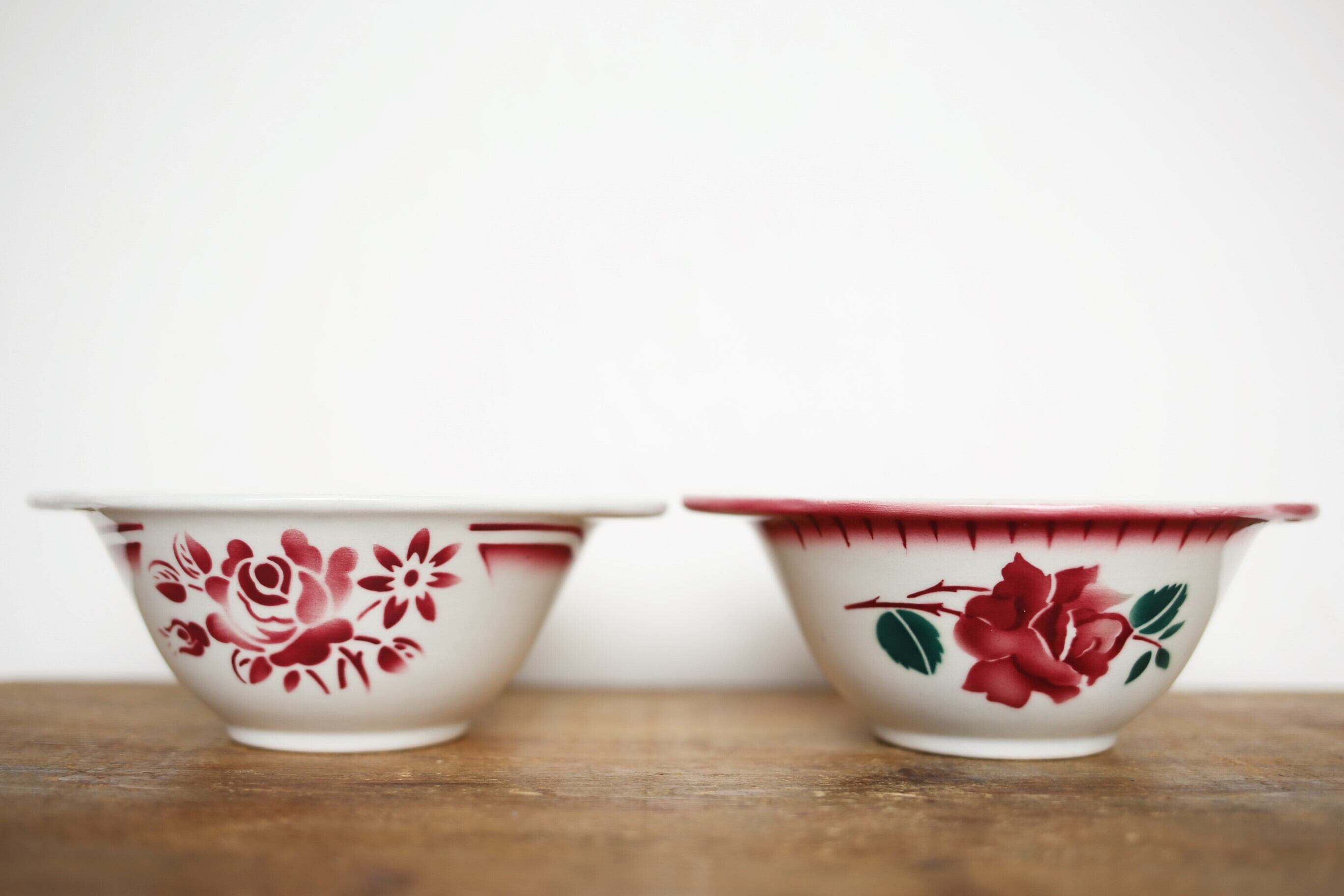 ぽってりと厚手で丸みのある陶器にバラや小花の花模様が素敵なボウルです。