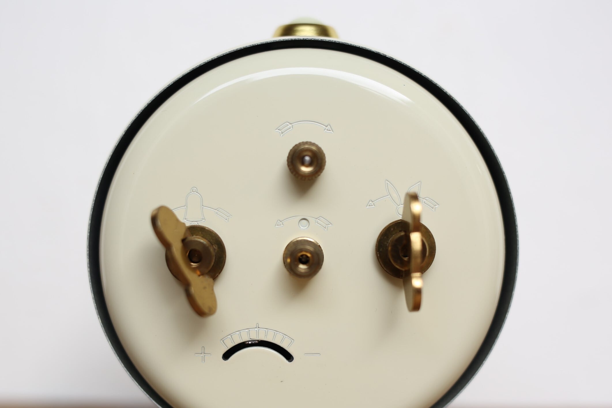 裏面の右側のゼンマイが時計のムーブメント用、左側のゼンマイが目覚ましベル用です。