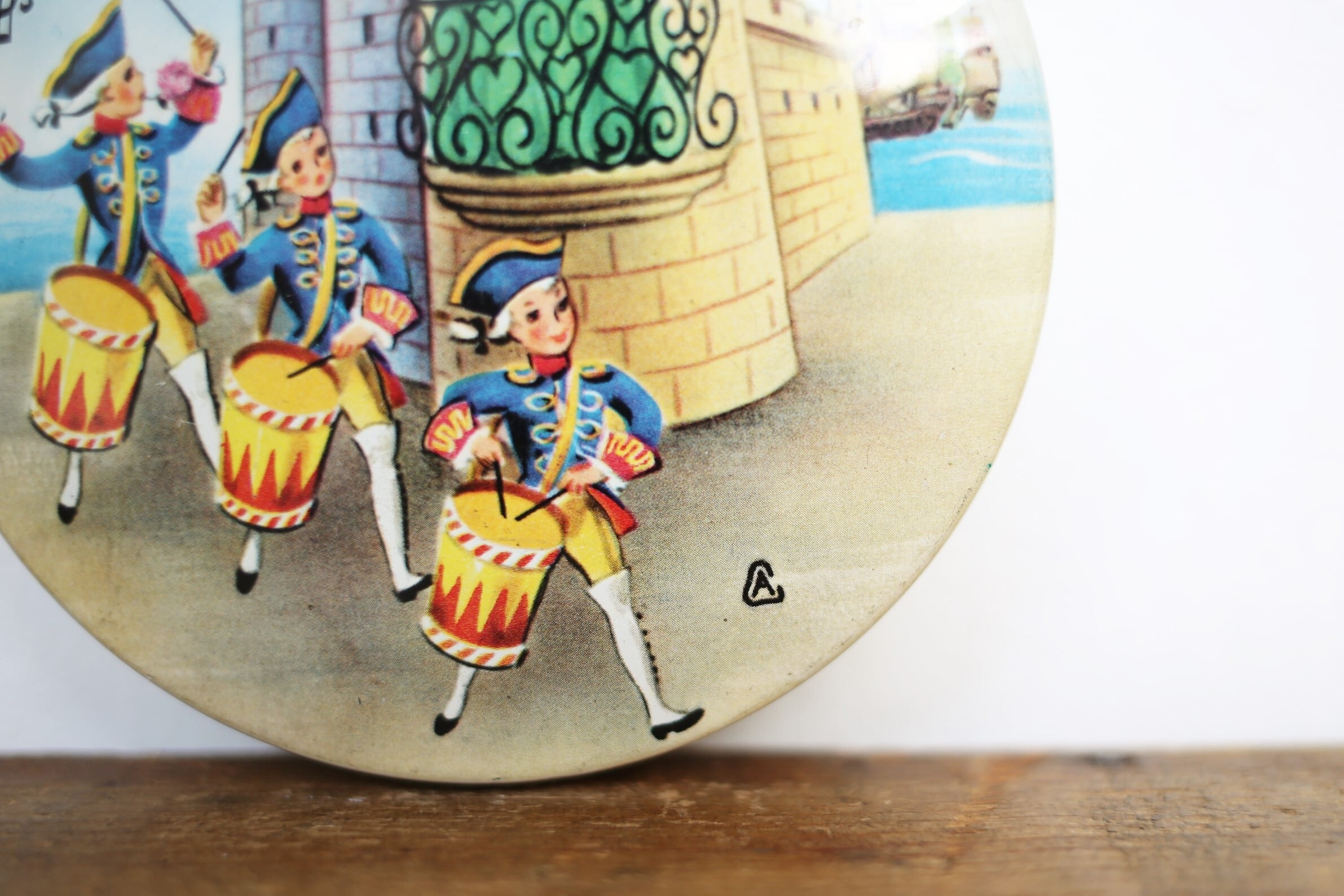 少し丸みのあるフォルムの缶に手前から鼓笛隊、城とお姫様、奥に海と船と遠近感のある絵で素敵に描かれています。