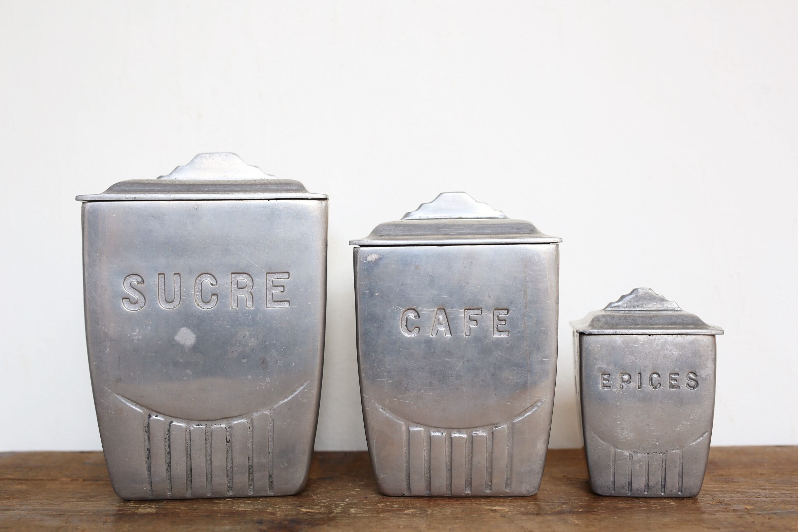 フランスで見つけたとても珍しい重厚なアルミ製(鋳造アルミかアルミダイキャスト)のキャニスターです。