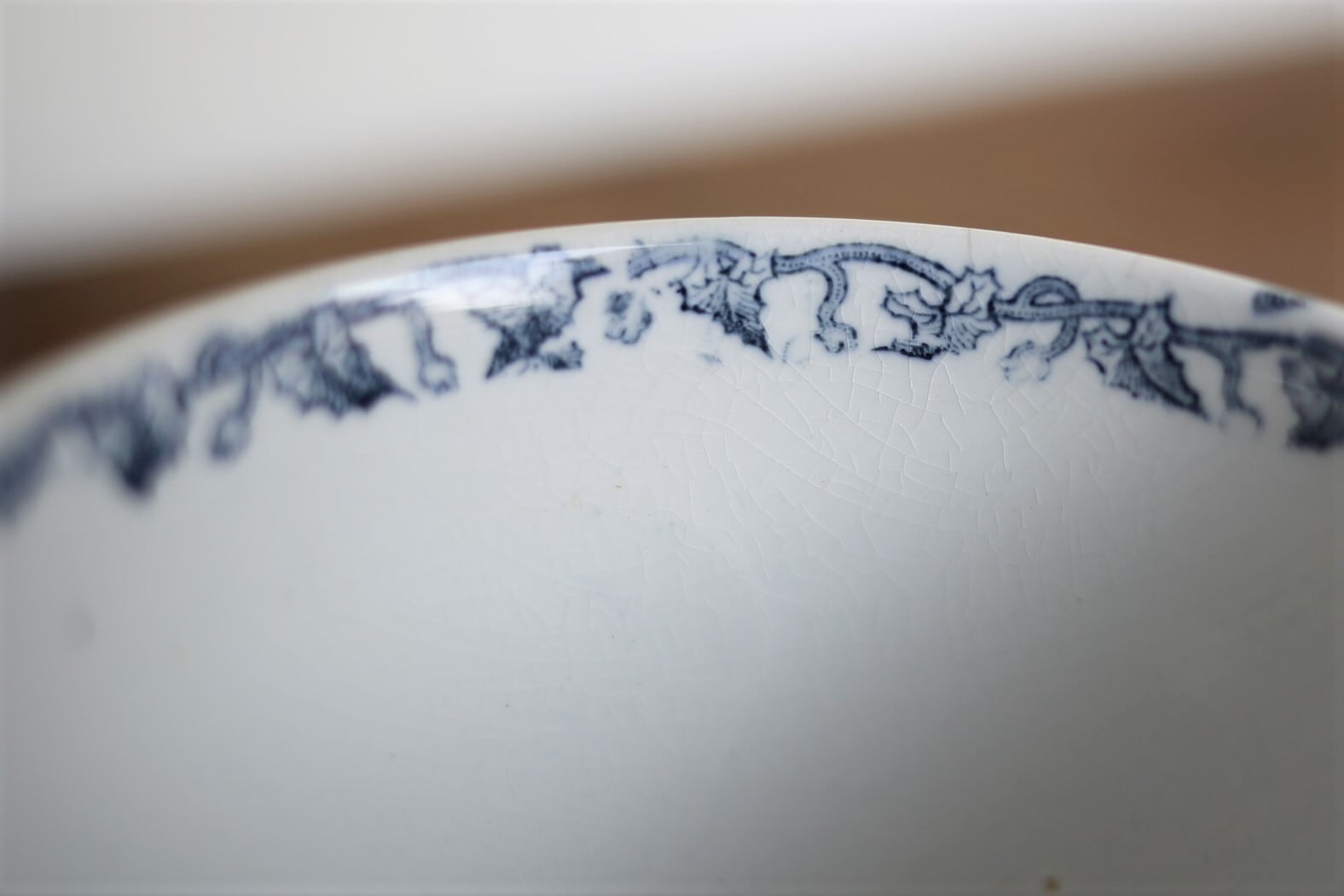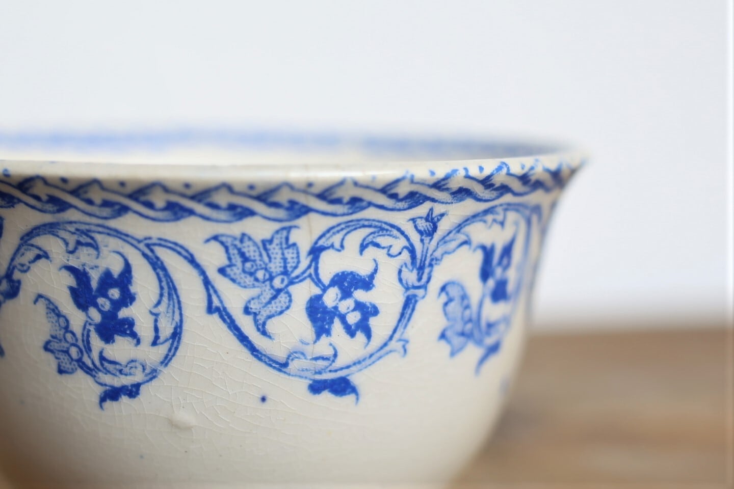 アイボリーの優しい陶器に落ち着きもありながら鮮やかなブルーの柄が映え、釉薬の輝きと全体に細かく入った貫入の雰囲気がとても美しい逸品です。