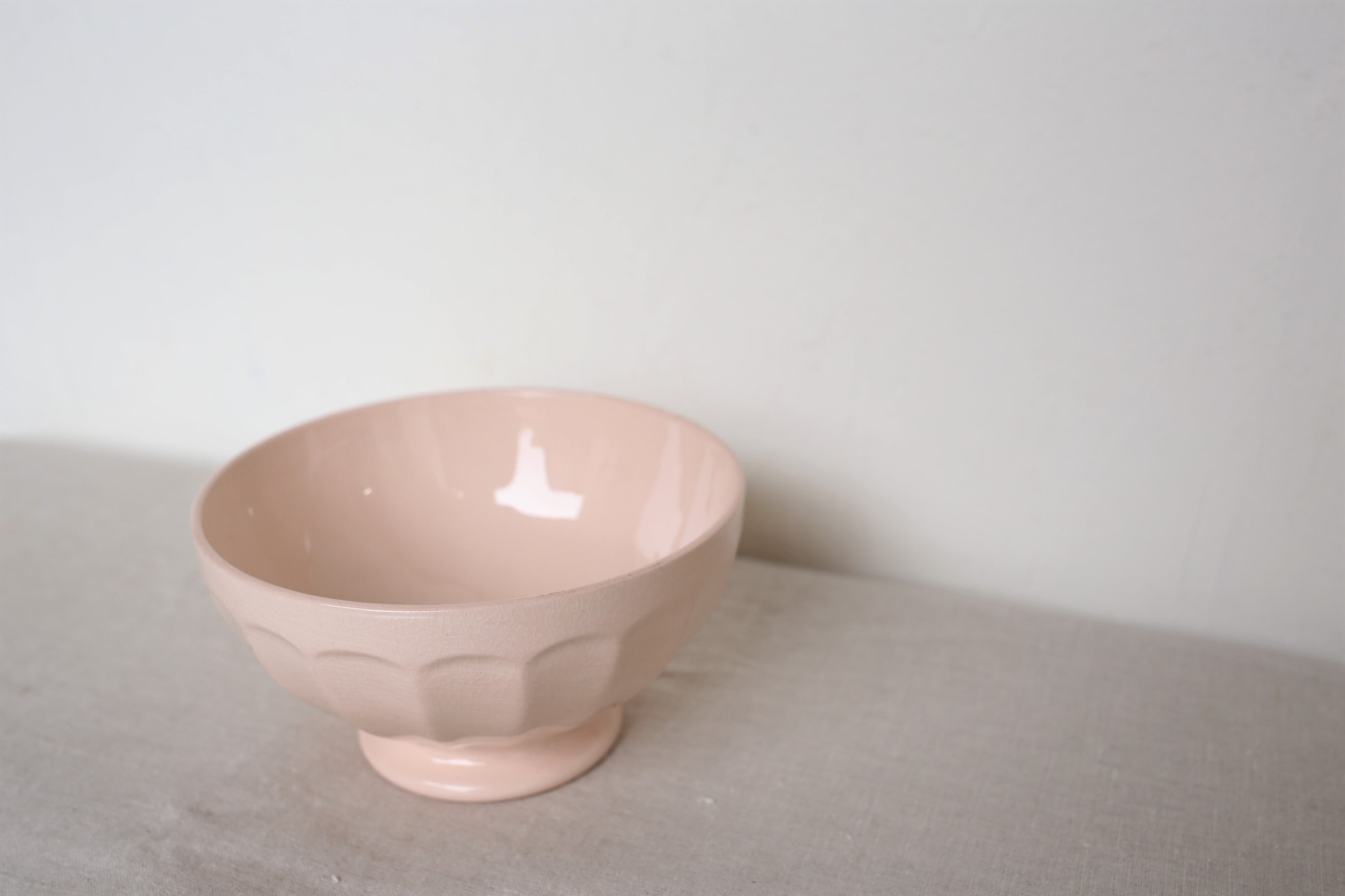 全体に細かく入った貫入や釉薬の艶、薄い落ち着いたピンク色がとても素敵です。