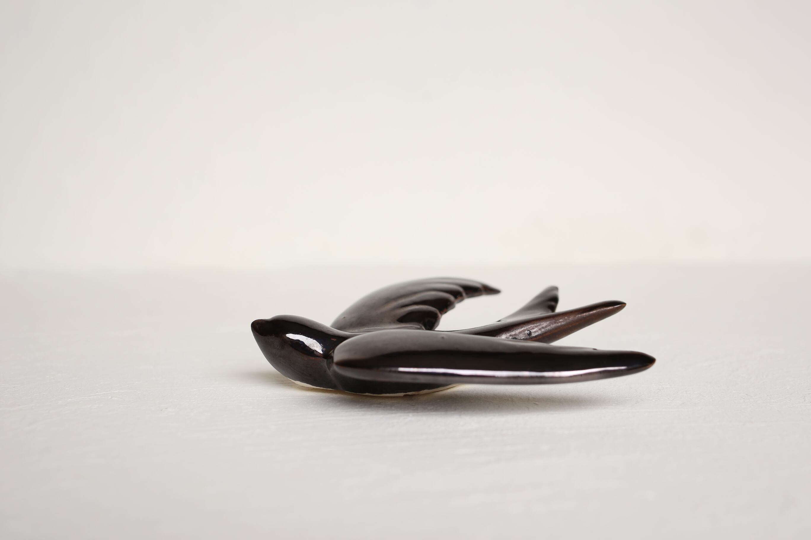 こちらは濃いブラウンのような独特な色合いに鏡面のように艶のある釉薬が素敵なツバメです。