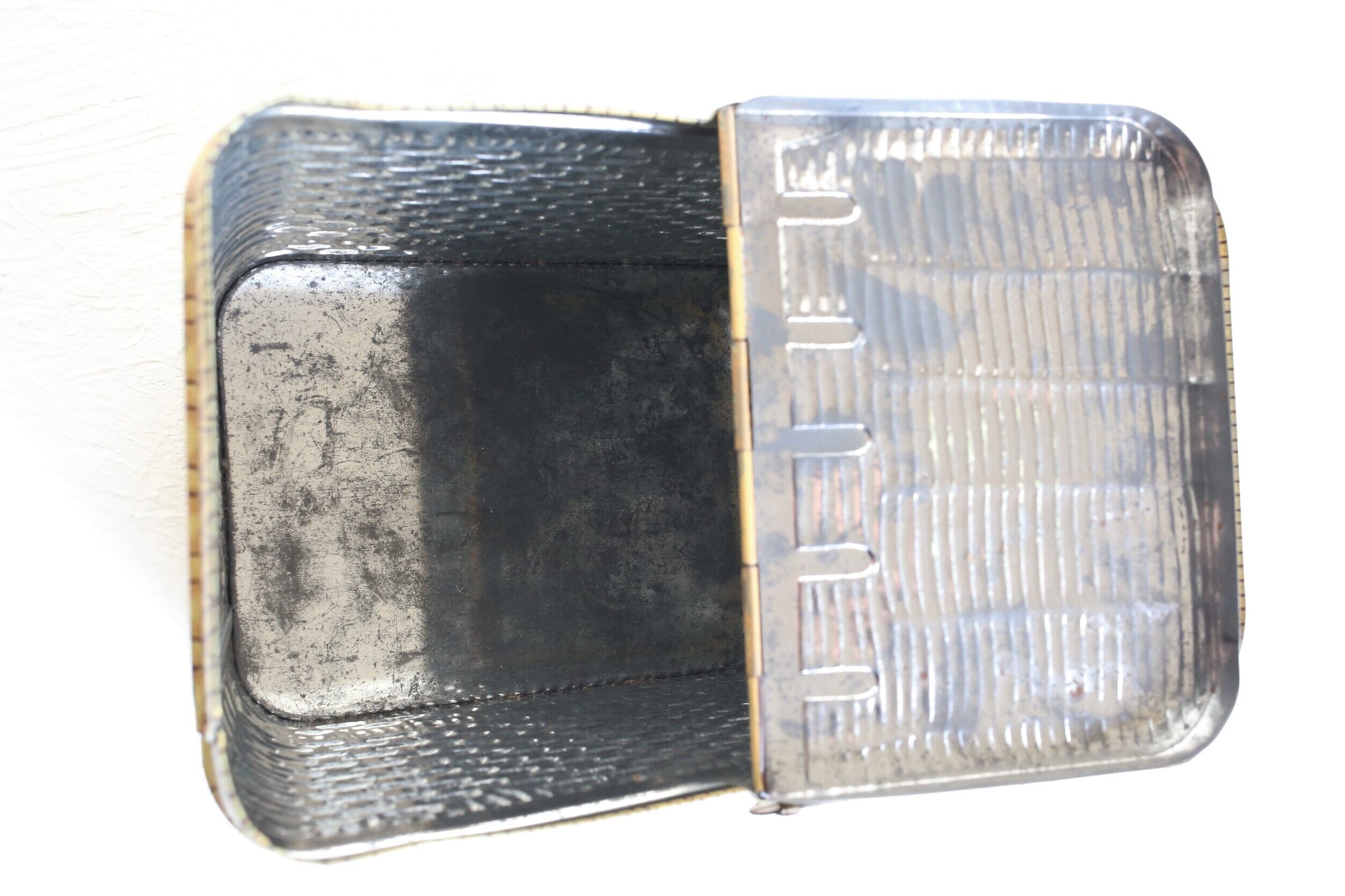編み込み柄の部分は凹凸があり、両側が開く蓋など細部までこだわって作られている素敵な缶です。