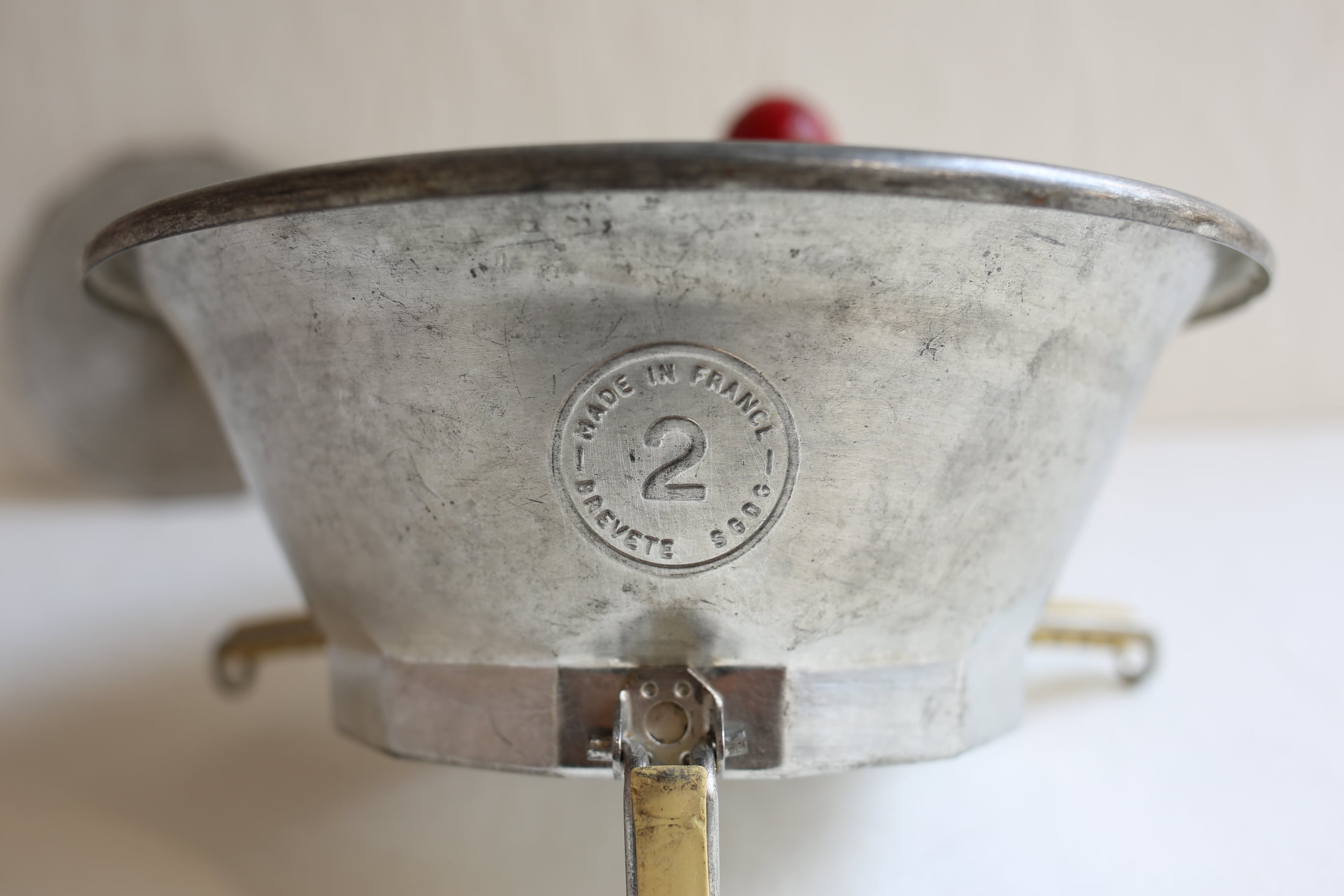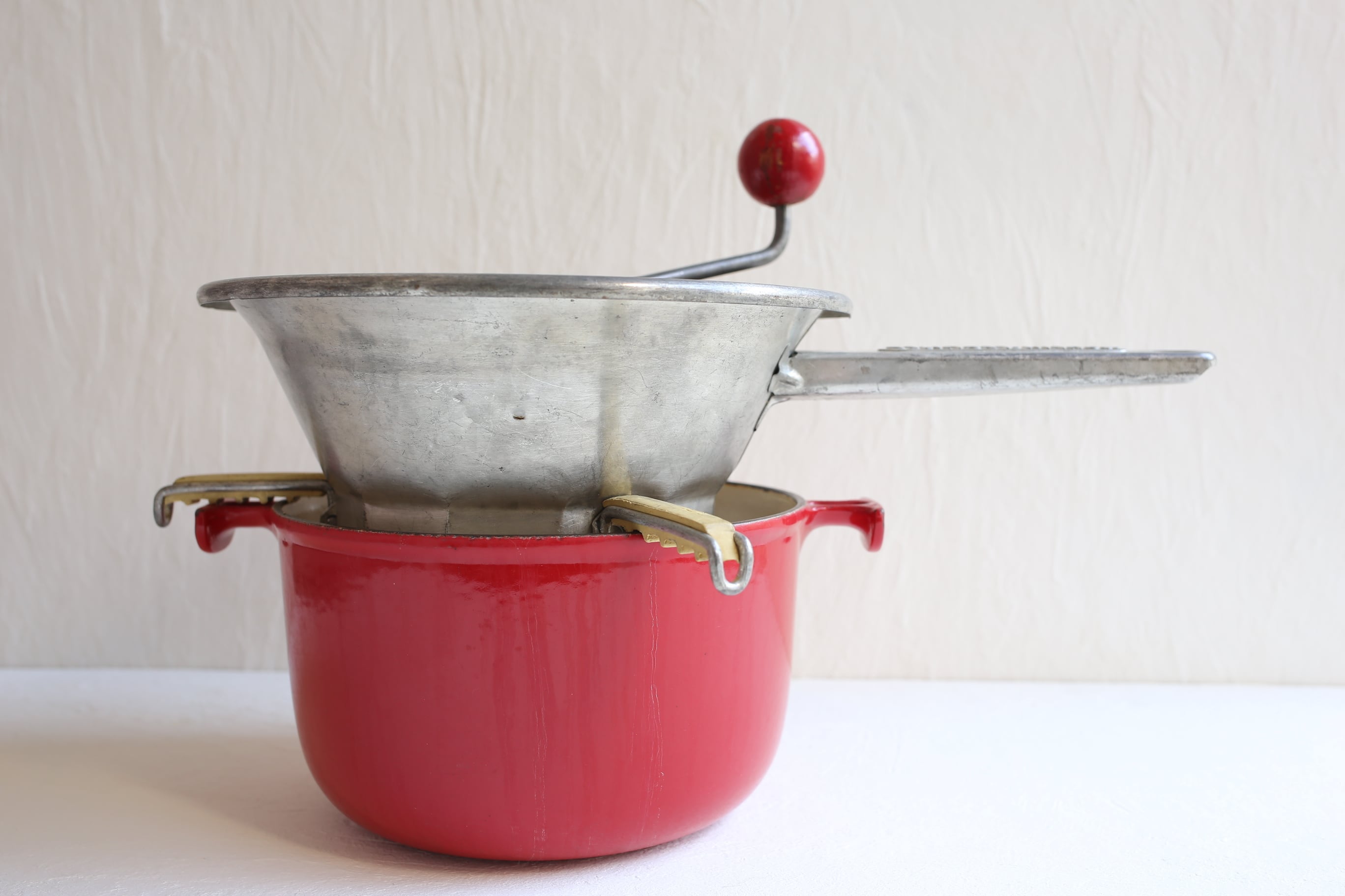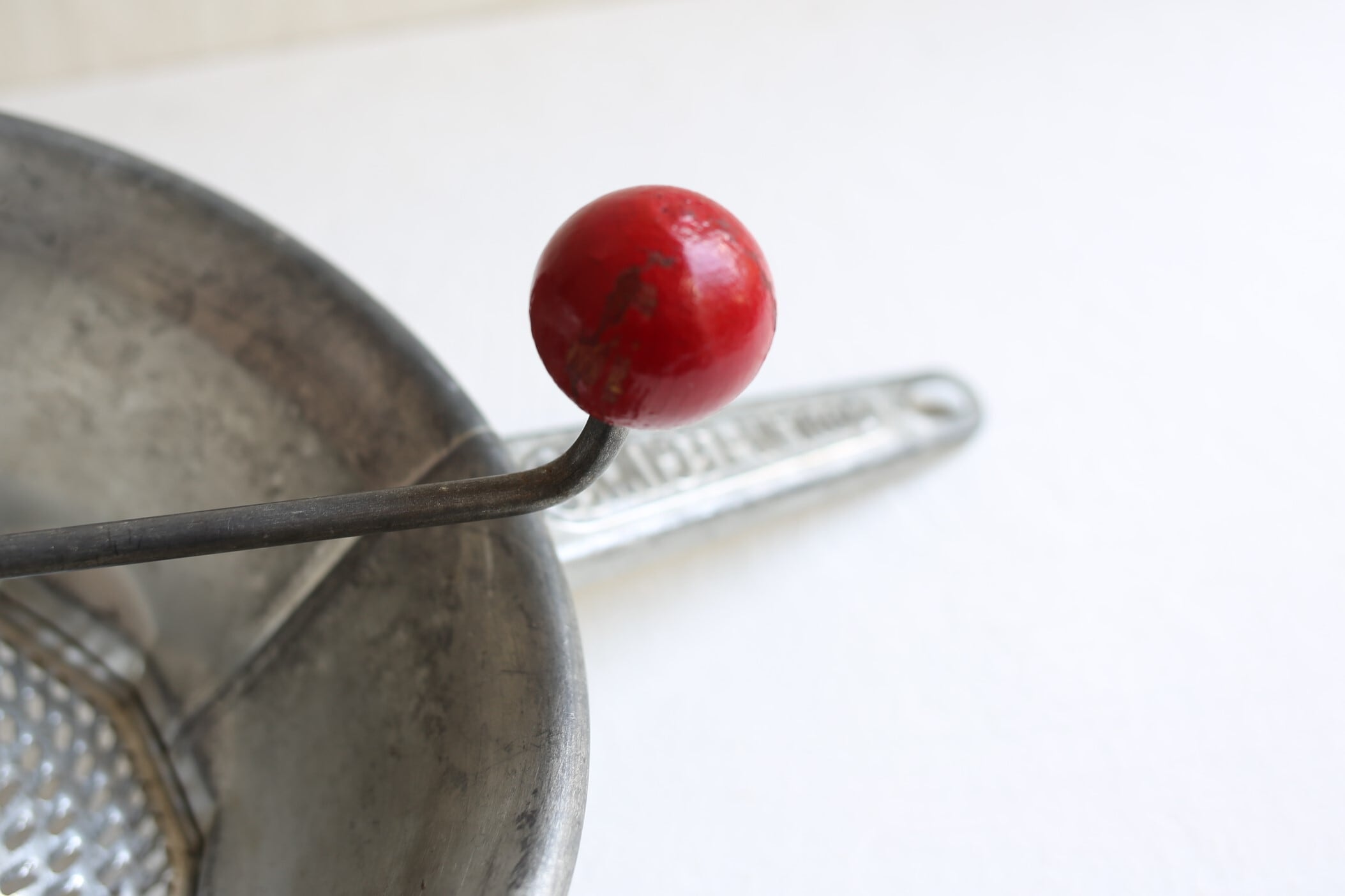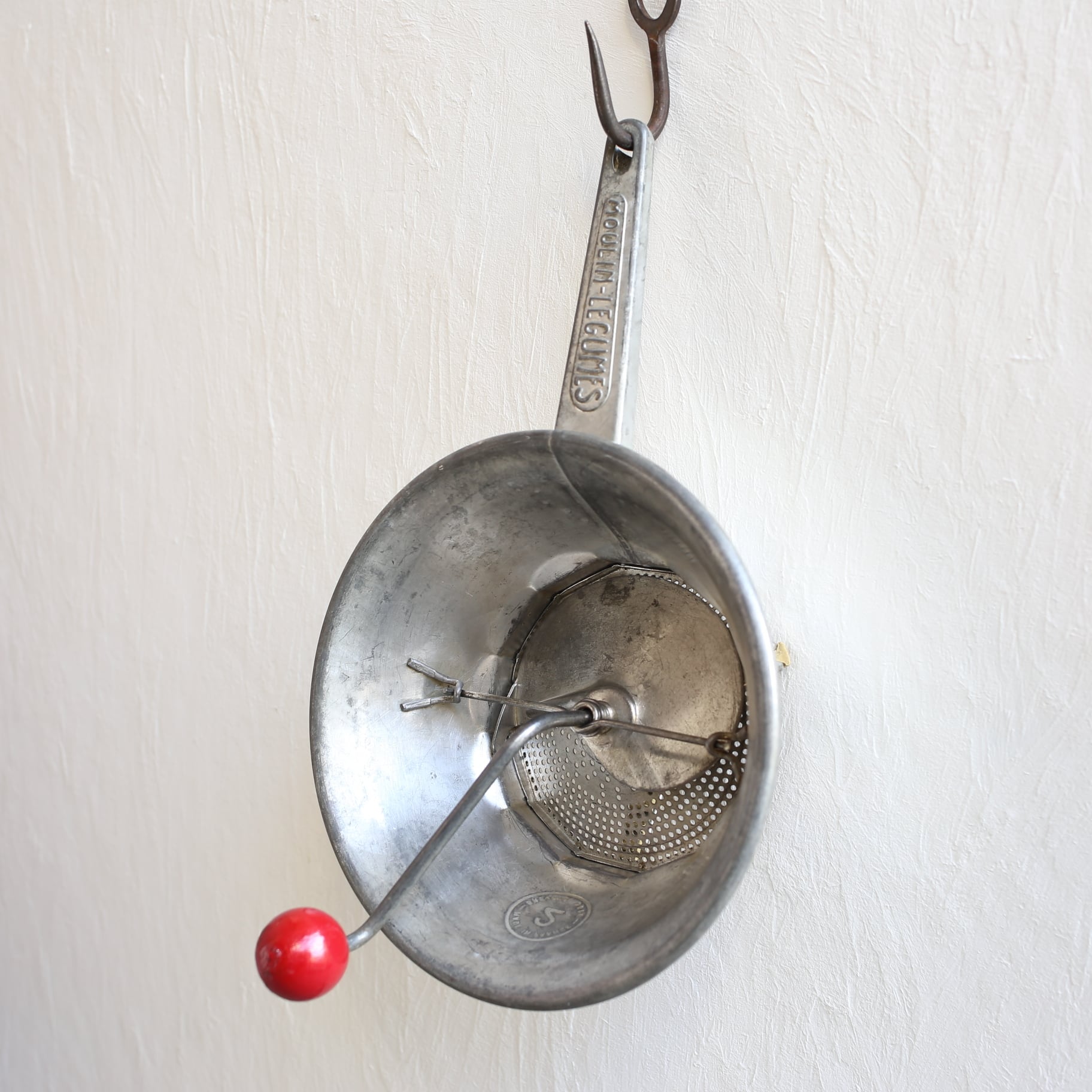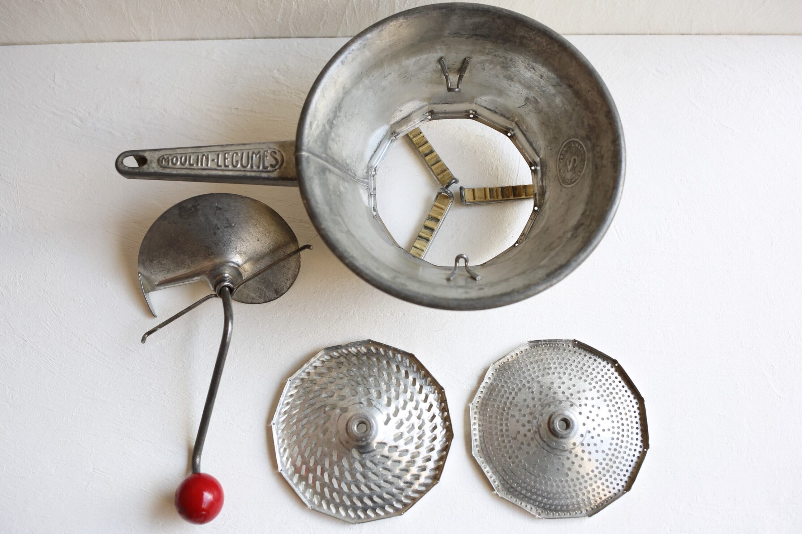 トマトを漉したり野菜をピューレする為のブリキ製の器具ですが、とても魅力的なデザインでハンドルの持ち手の木製の赤いボールが良いアクセントになっています。