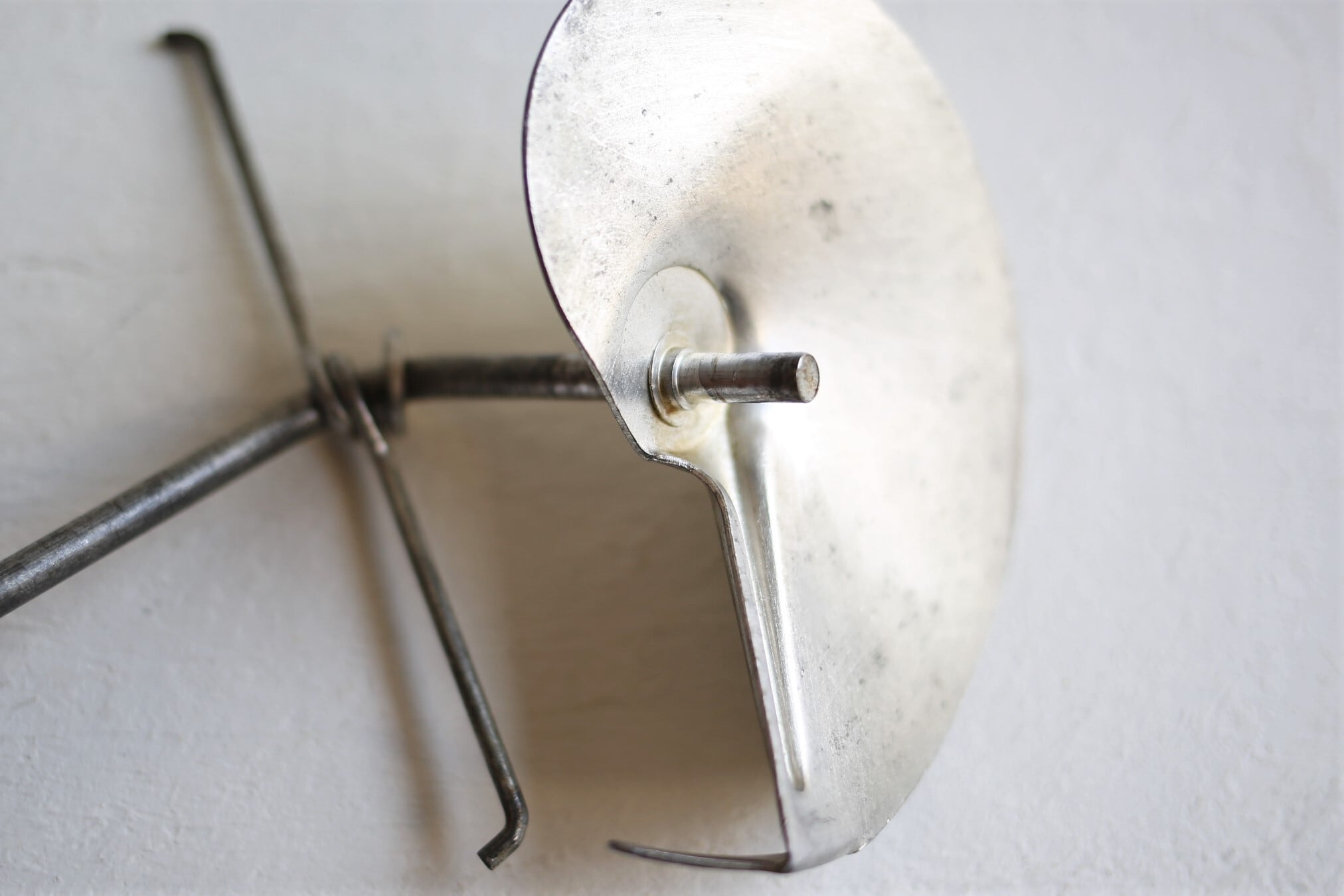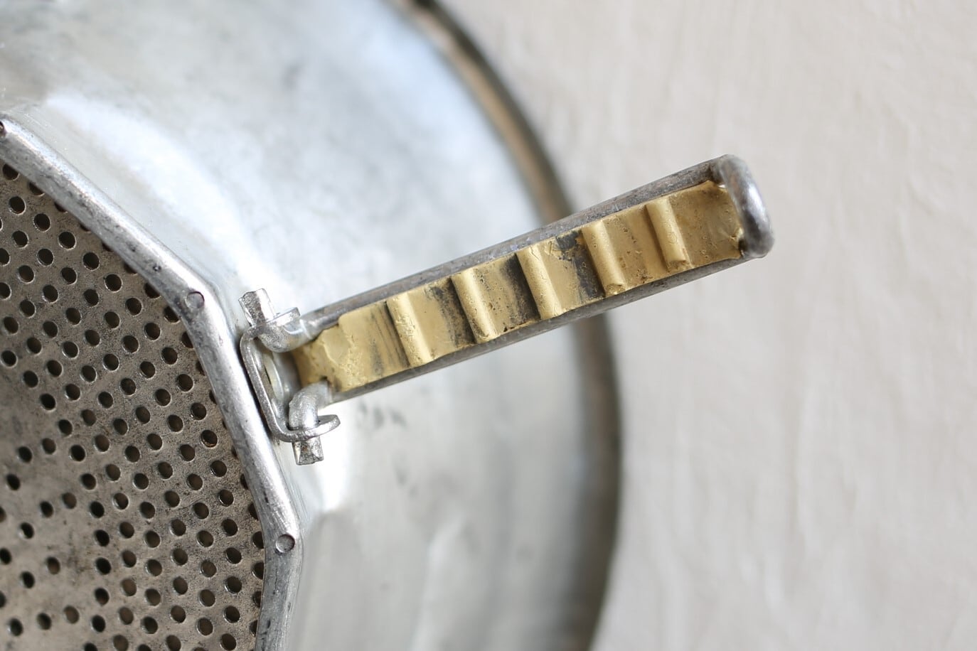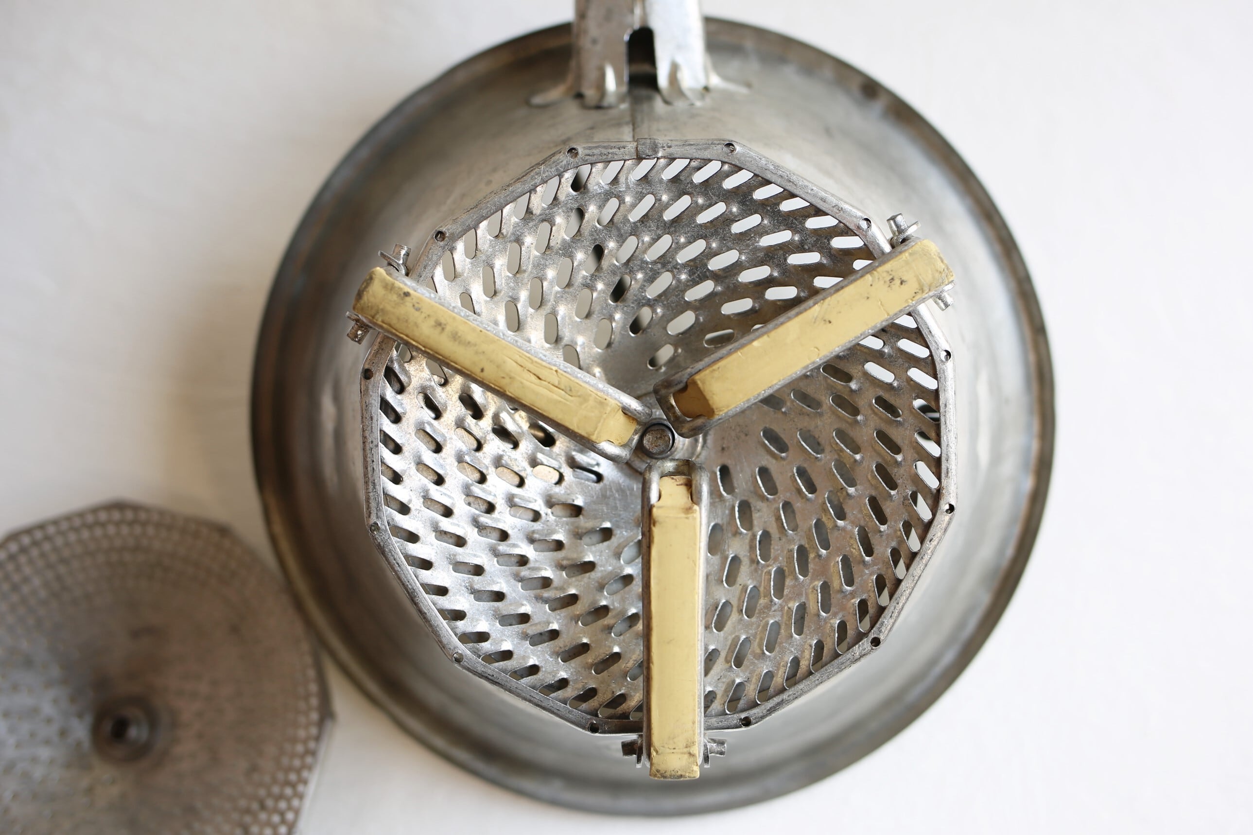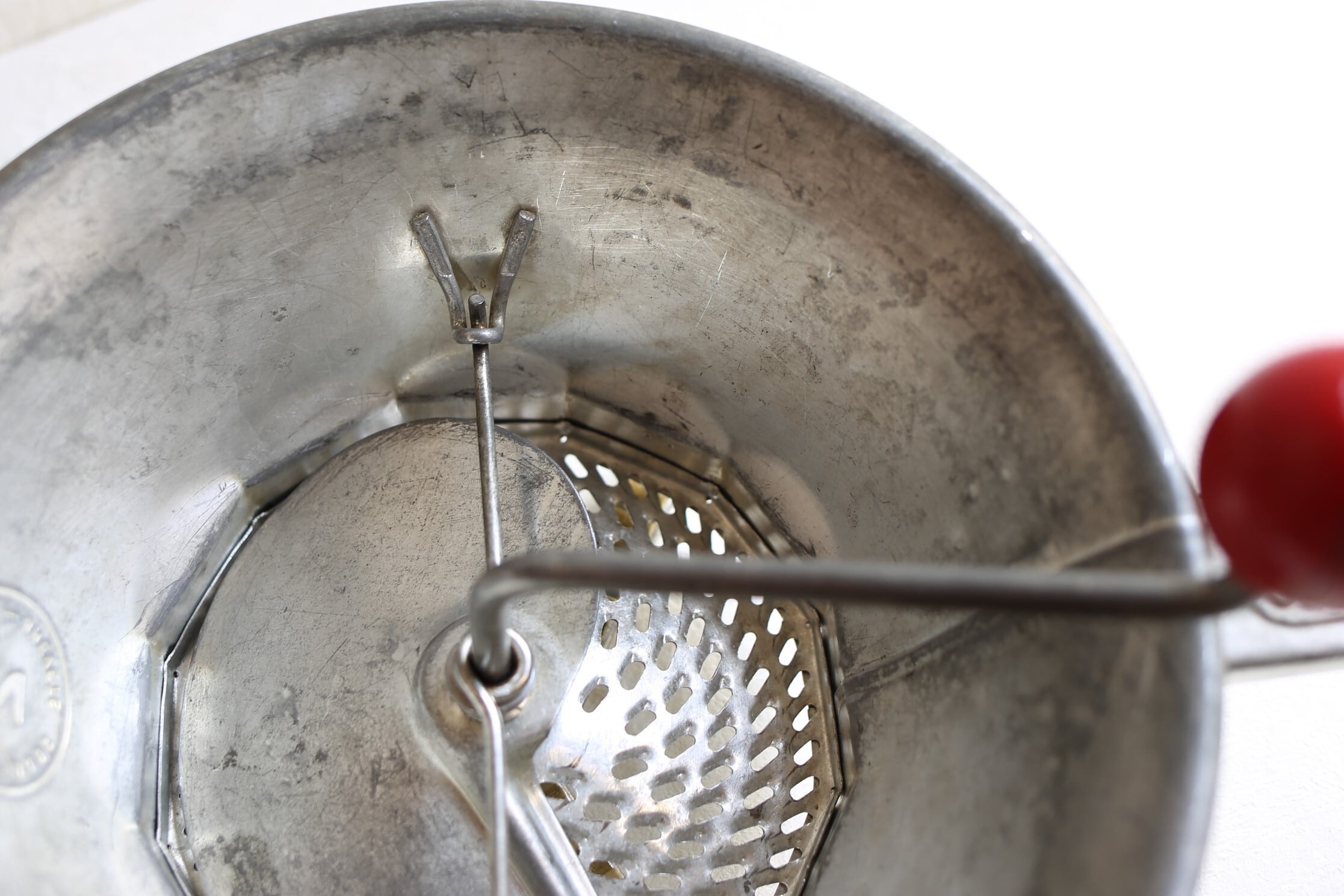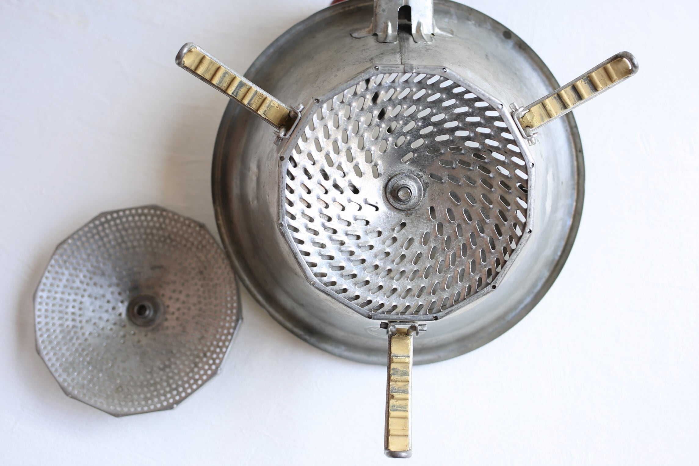 トマトを漉したり野菜をピューレする為のブリキ製の器具ですが、とても魅力的なデザインでハンドルの持ち手の木製の赤いボールが良いアクセントになっています。