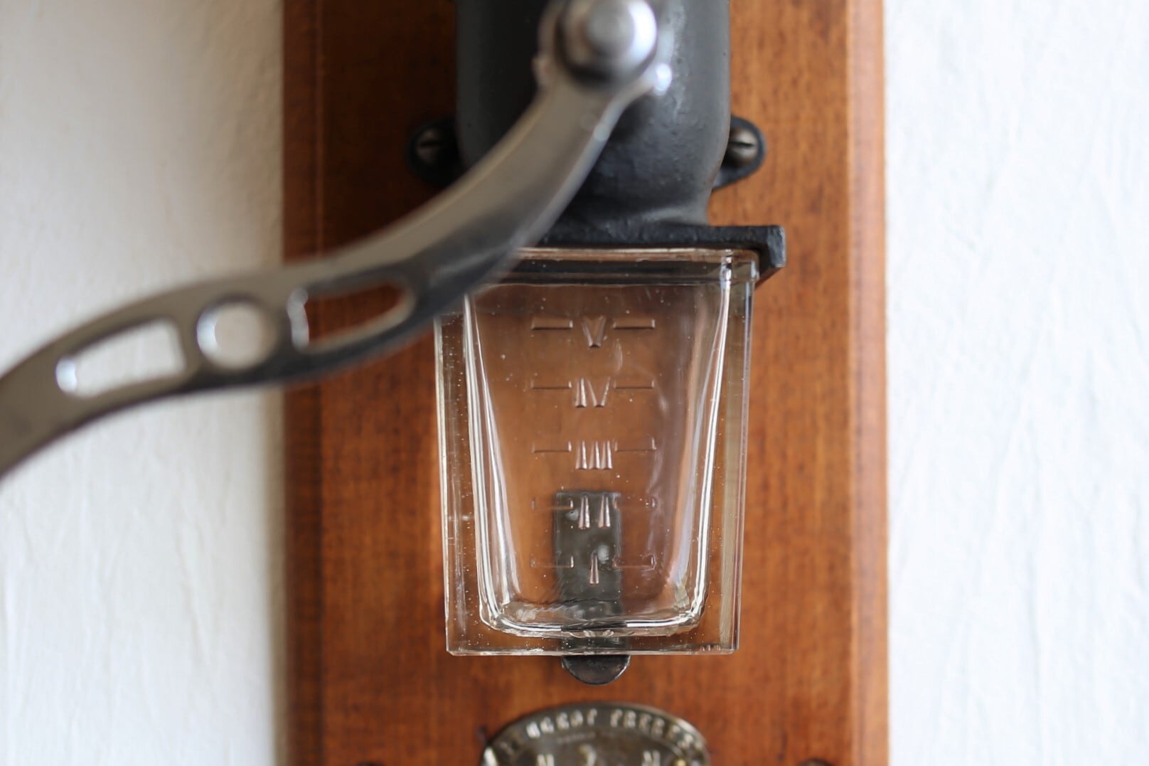 ハンドル下のピンロックを持ち上げて下のダイヤルを回すと挽き加減が調整できますが、右に回すと細挽き、 左に回すと粗挽きになります。