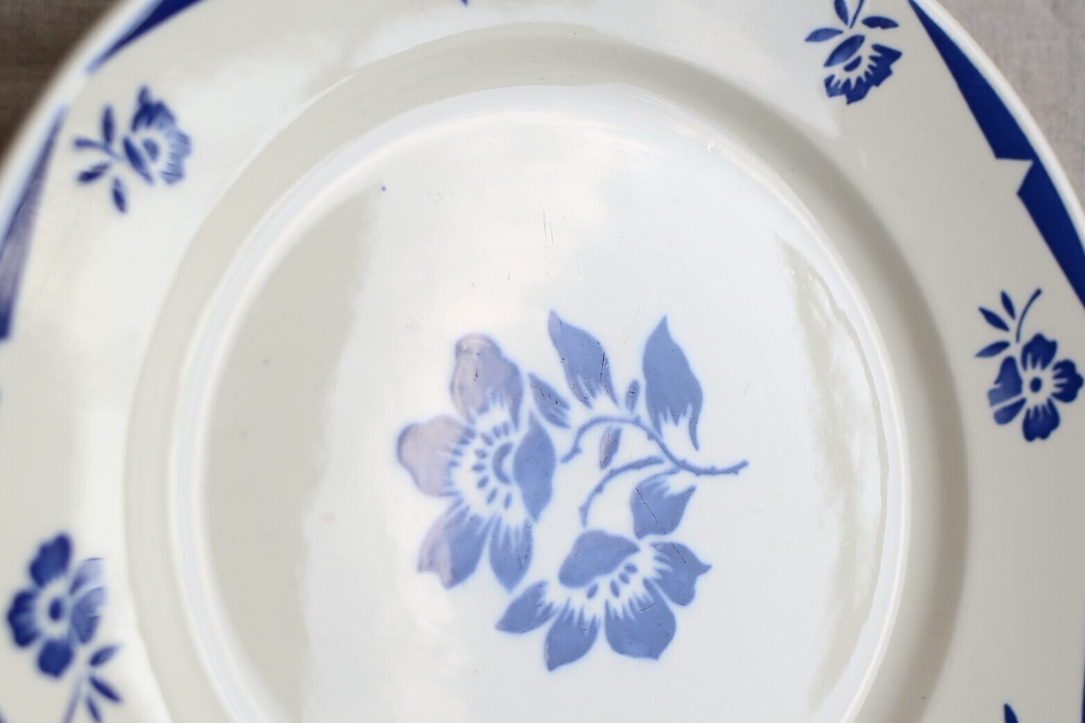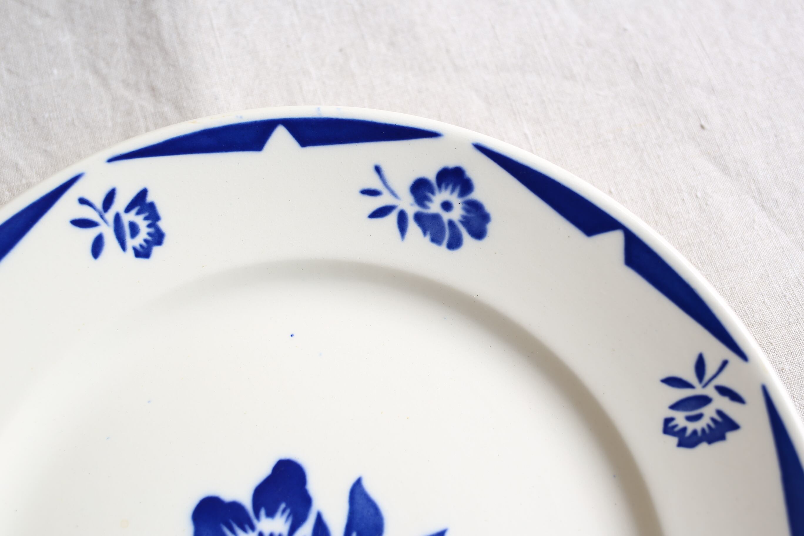 花模様と幾何学的な直線的なデザインの組み合わせが絶妙でロイヤルブルーに近い濃いブルーがとても映える素敵なお皿です。