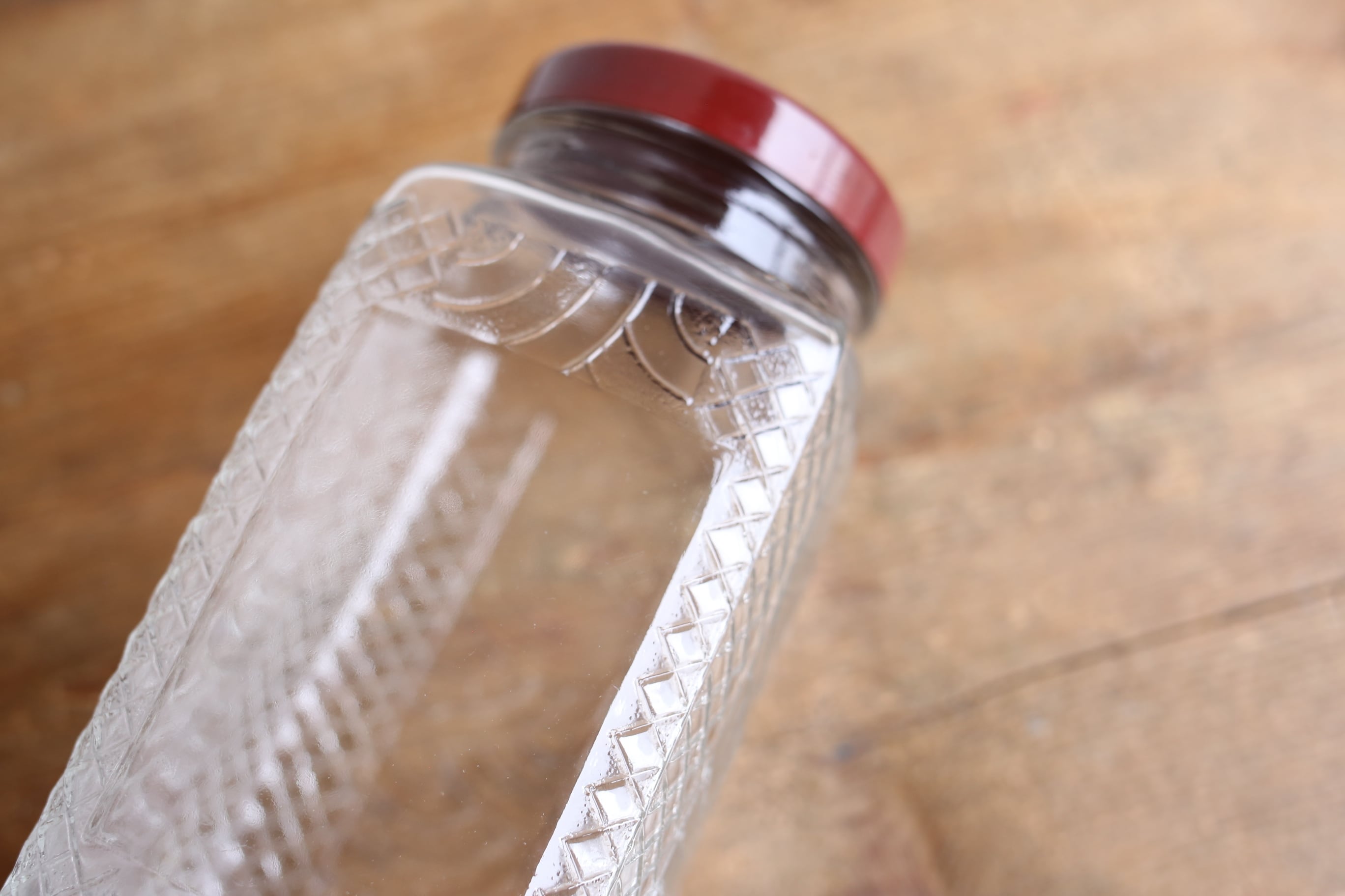 古いガラス製品ならでは揺れや気泡のあるガラスにアールデコ調の柄とベークライト製の蓋の組み合わせが素敵なキャニスター、保存瓶です。