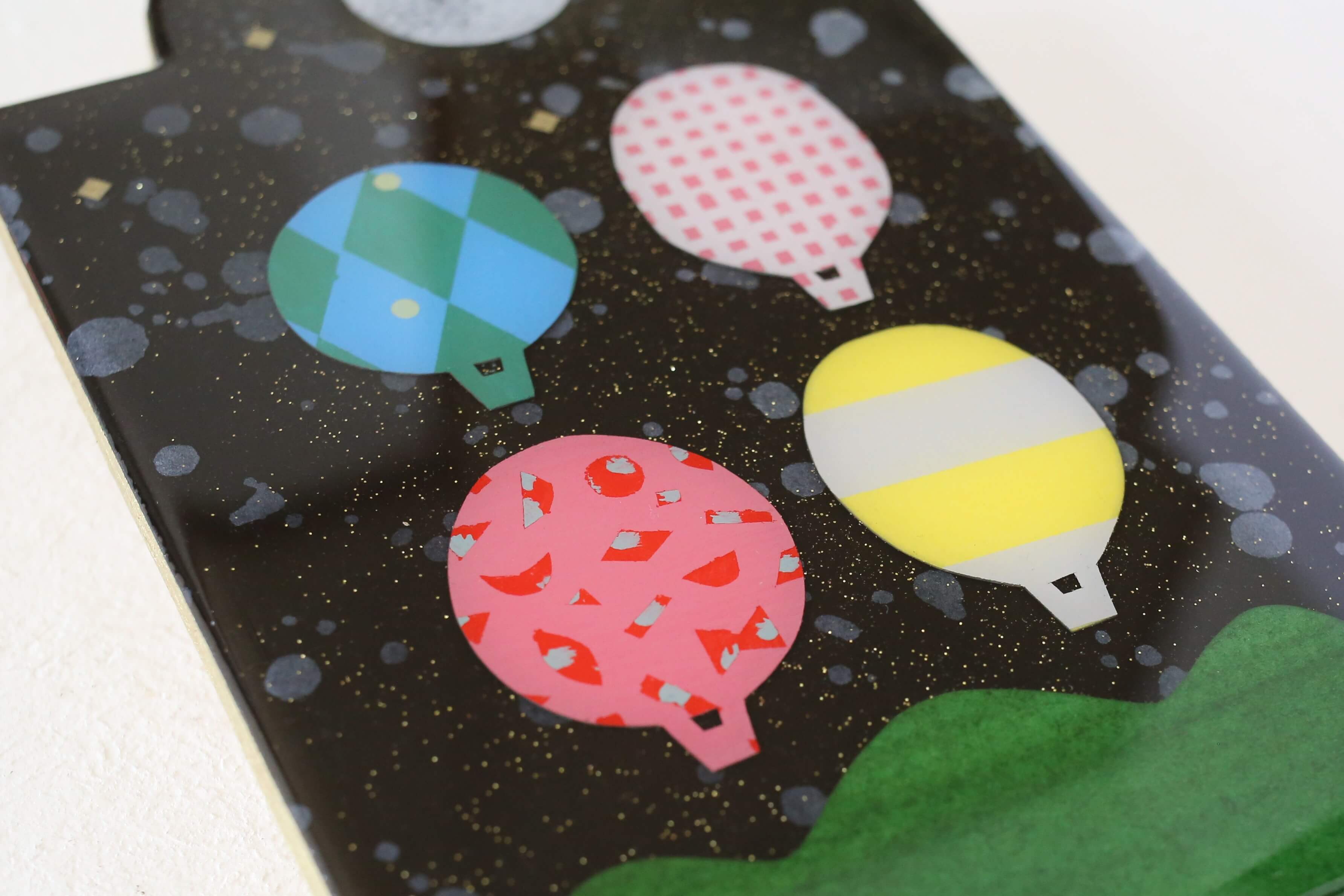 山の上に浮かぶ月と気球の壁掛けオブジェです。