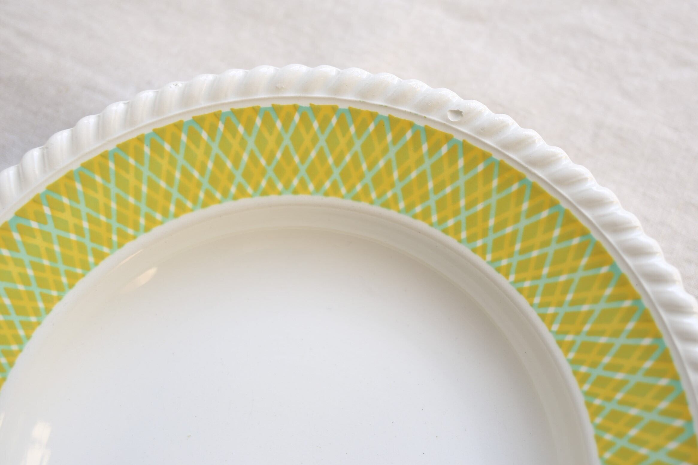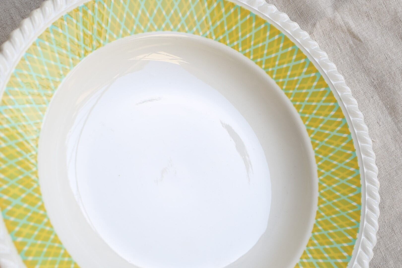 フリルになったリムとチェックの柄が可愛らしい深皿です。