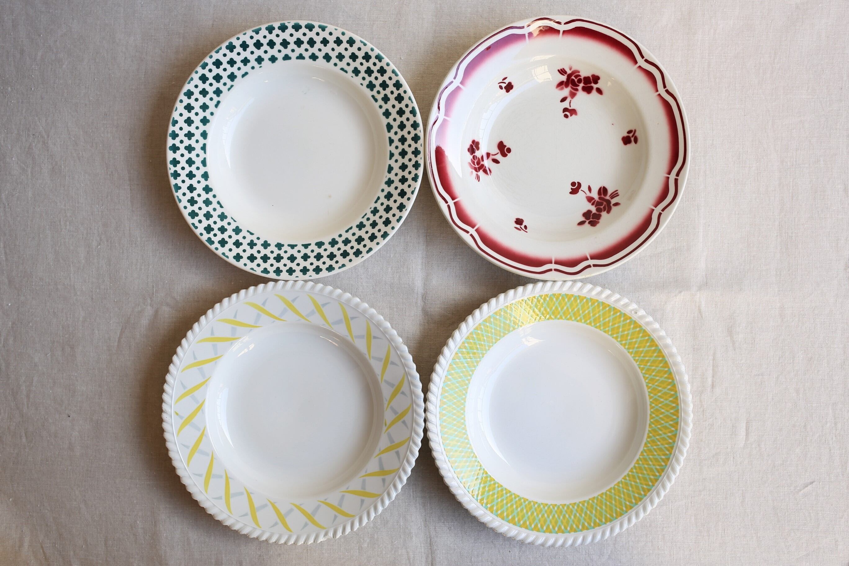 Badonvillerの「FB」刻印が使われていた時代の深皿でフリルになったリムと薄いグレー×イエローの柄が明るい印象です。
