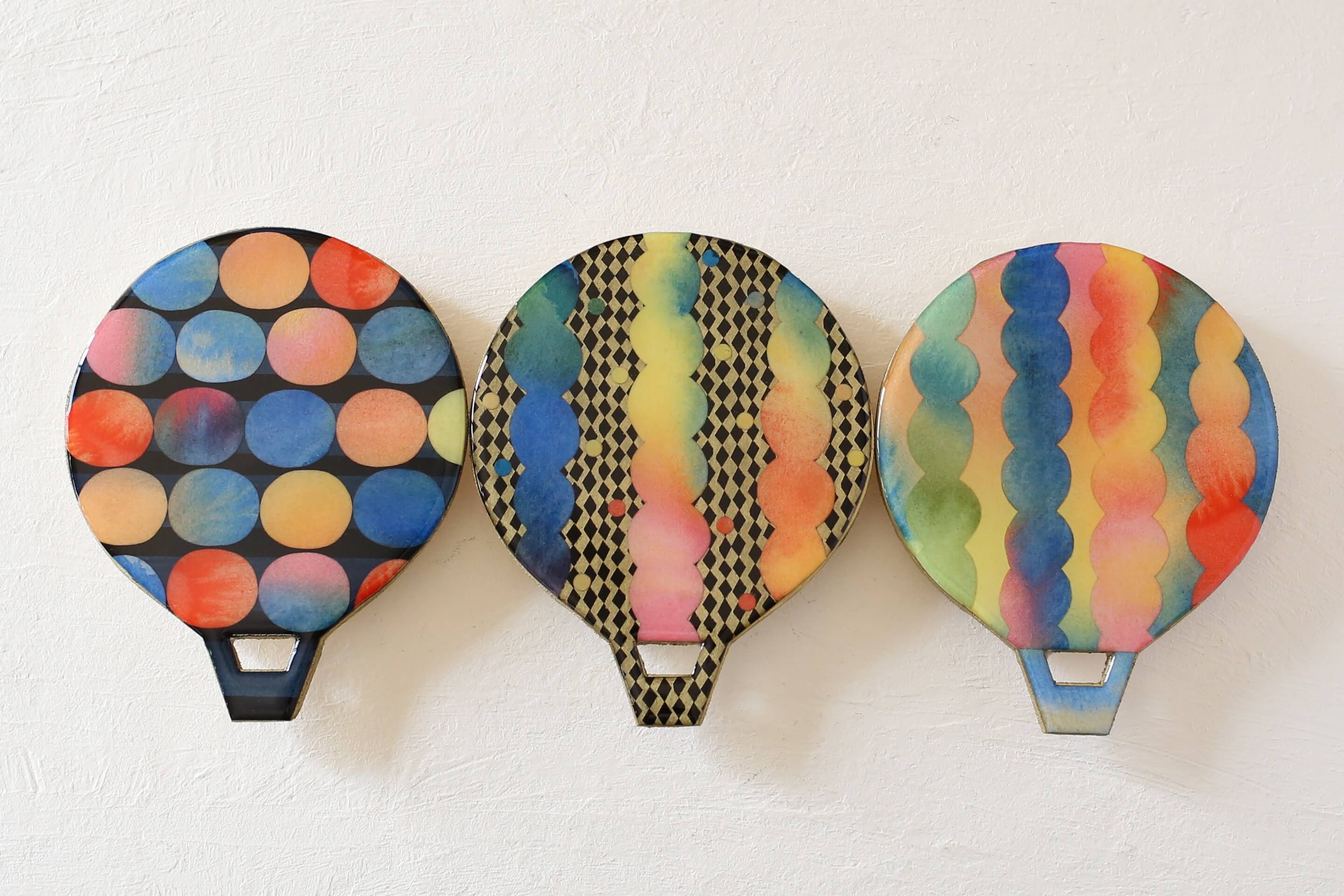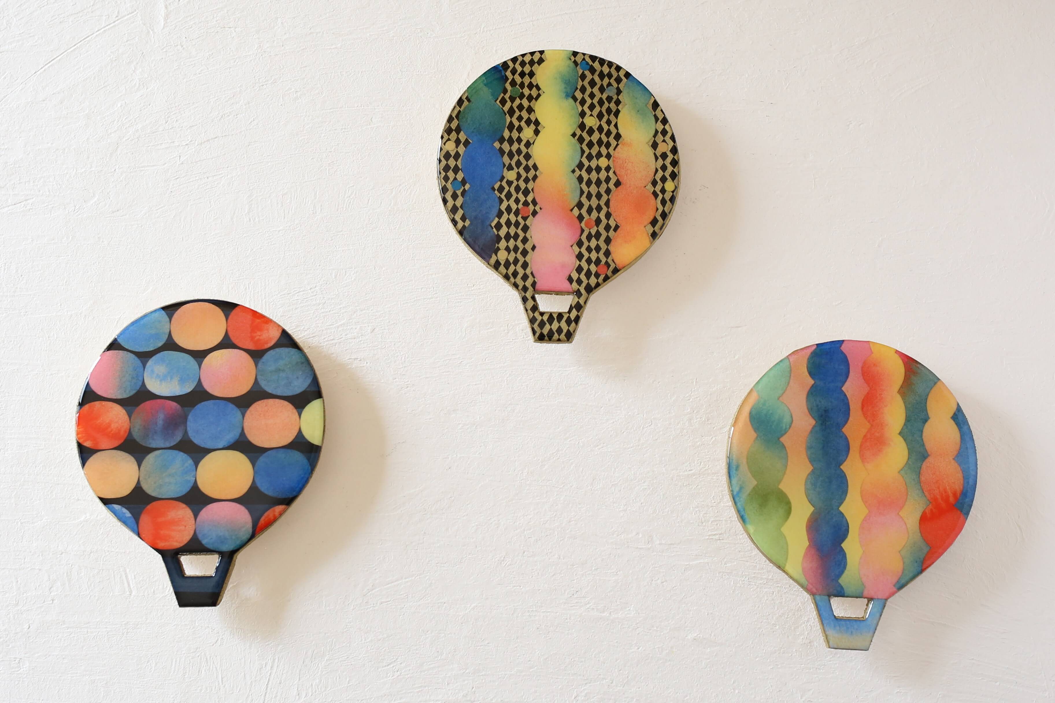 気球型に加工した木製板を土台にコラージュで制作しました。