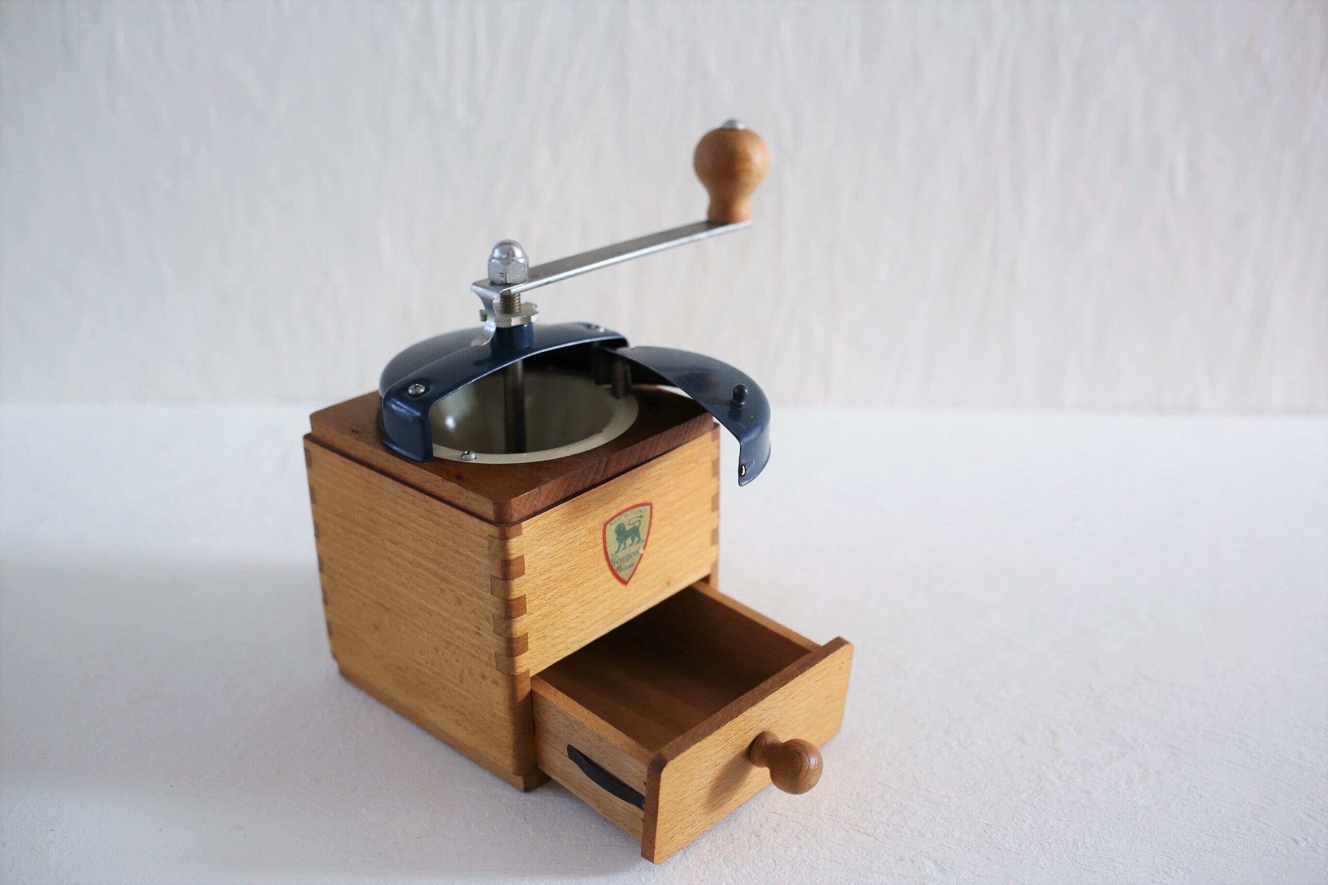 木製ボディの温かみに青いスチールの蓋がアクセントになった素敵なコーヒーミルです。