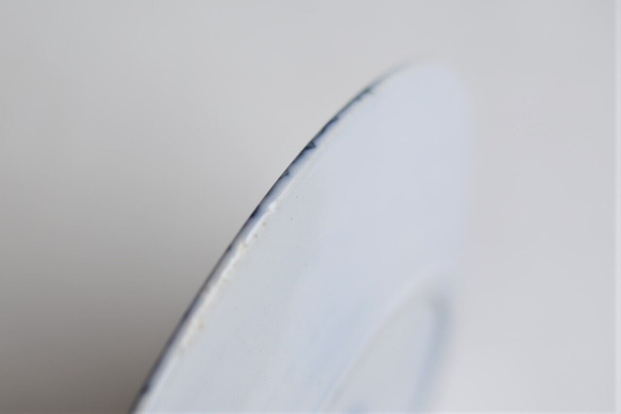 縁チップやスレ、リムの裏側に釉薬の抜け、高台にシミがあります。