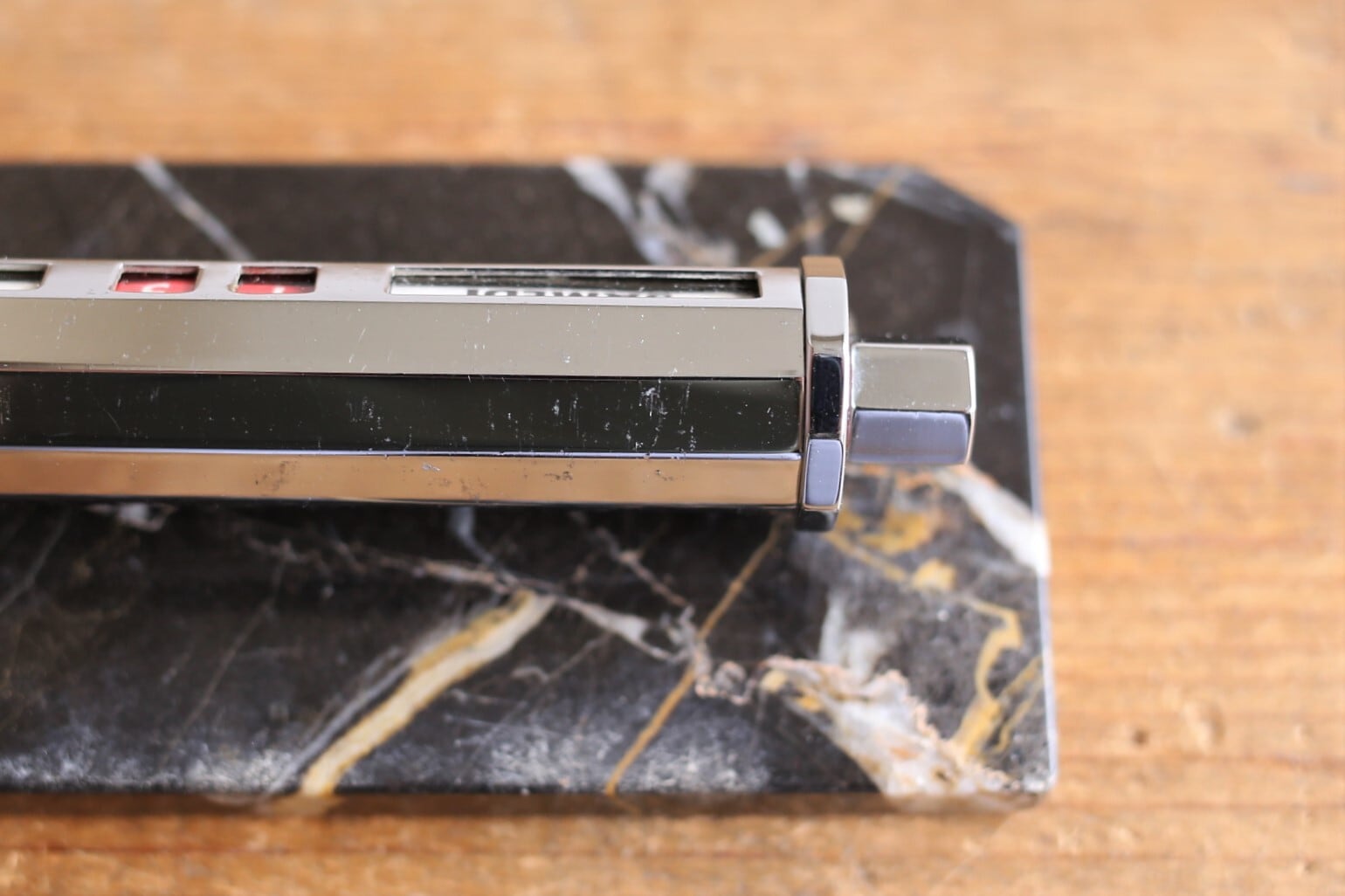 曜日、日にち、月の表示は左右にある大小のツマミを回して動かします。