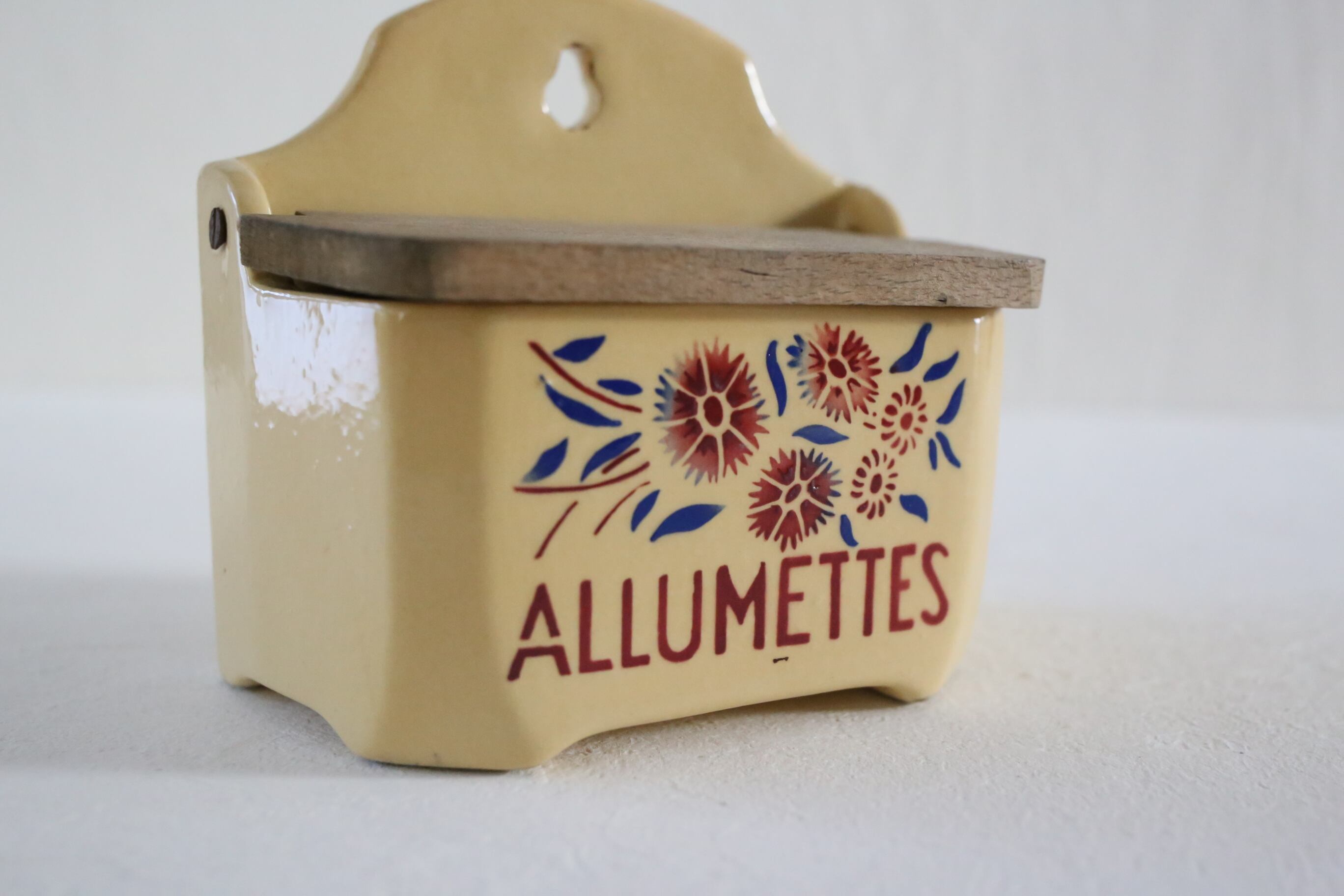 Allumettes =アルメットはフランス語でマッチの意味で、マッチを入れて壁に掛けられていたものです。