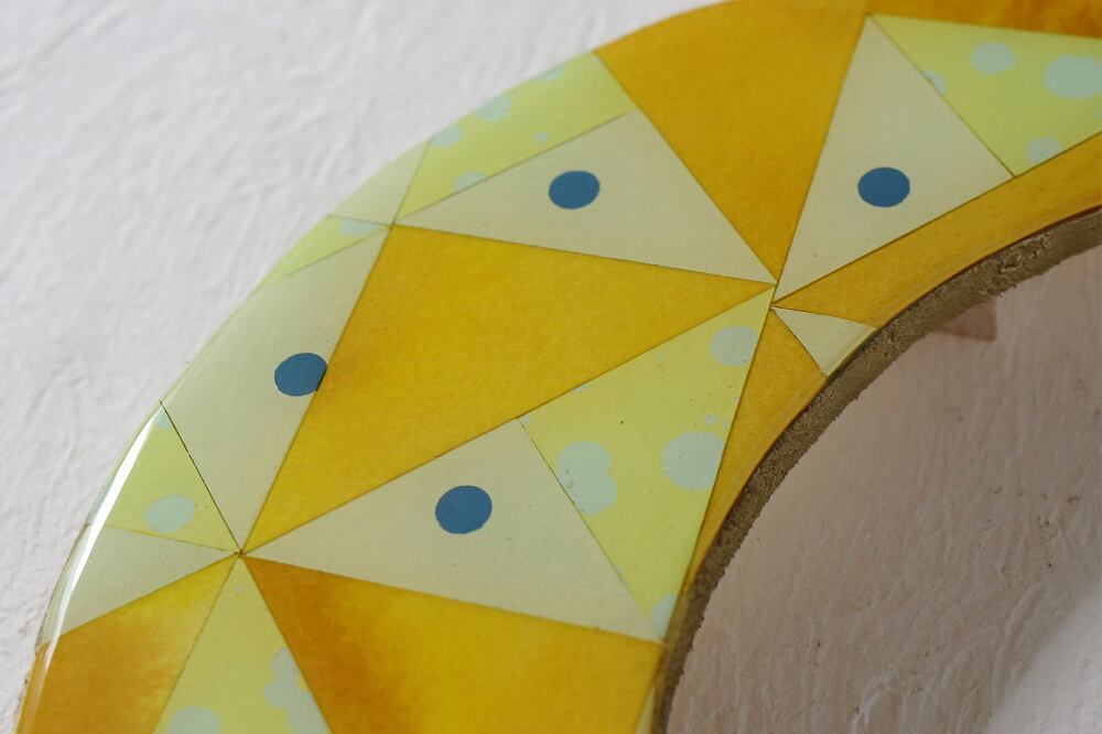 フランス在住の間にコラージュを始め、「ききゅう」や「パリの街」をテーマに作品制作を続けています。ペイントした紙を切り貼りしたものをエポキシレジン(樹脂)で覆っています。
