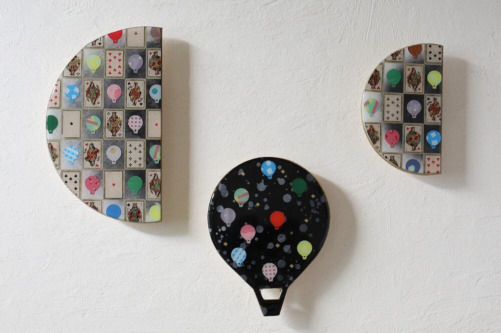 フランス在住の間にコラージュを始め、「ききゅう」や「パリの街」をテーマに作品制作を続けています。ペイントした紙を切り貼りしたものをエポキシレジン(樹脂)で覆っています。