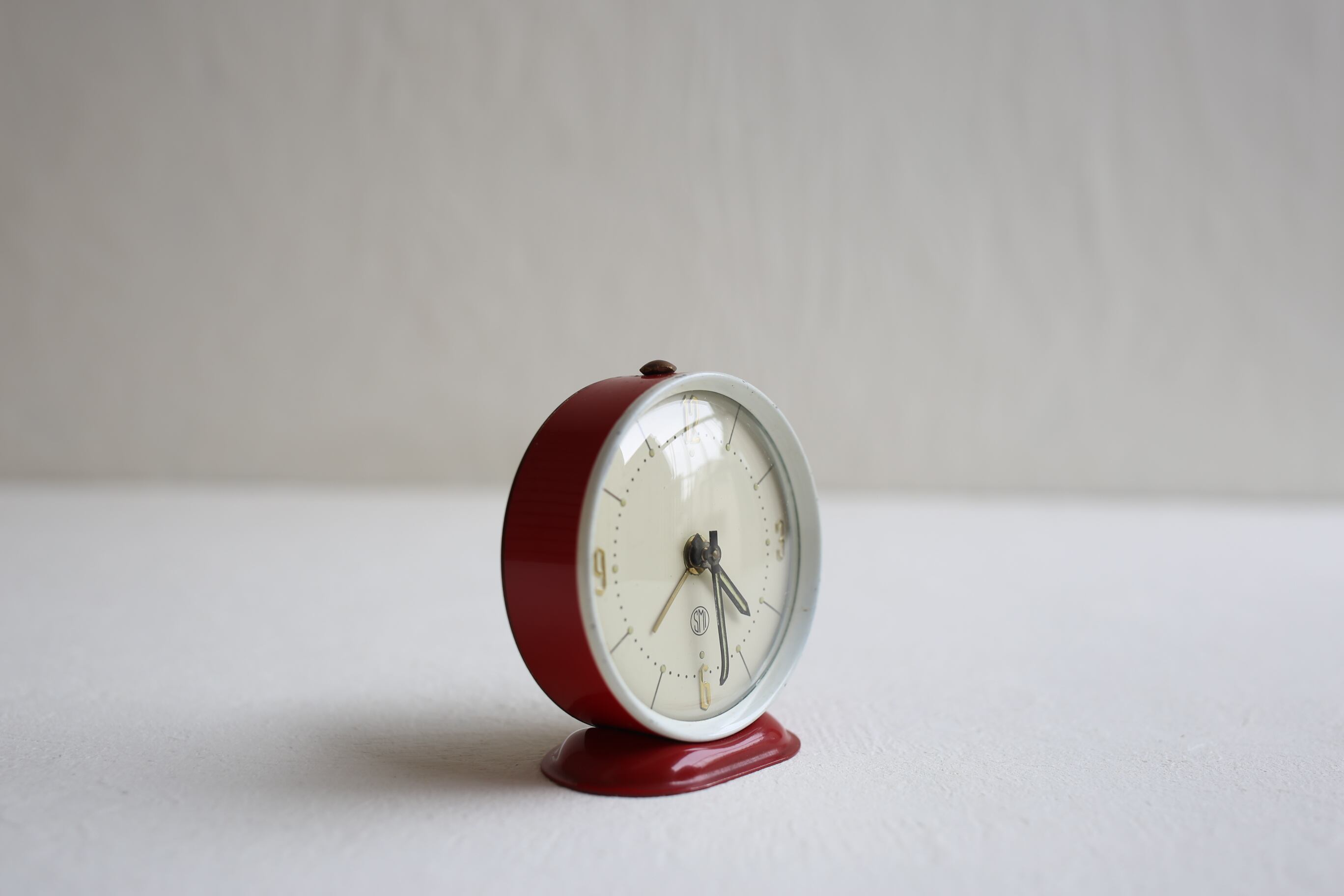落ち着いた赤に白が映えるSMI社の小さな目覚まし時計です。
