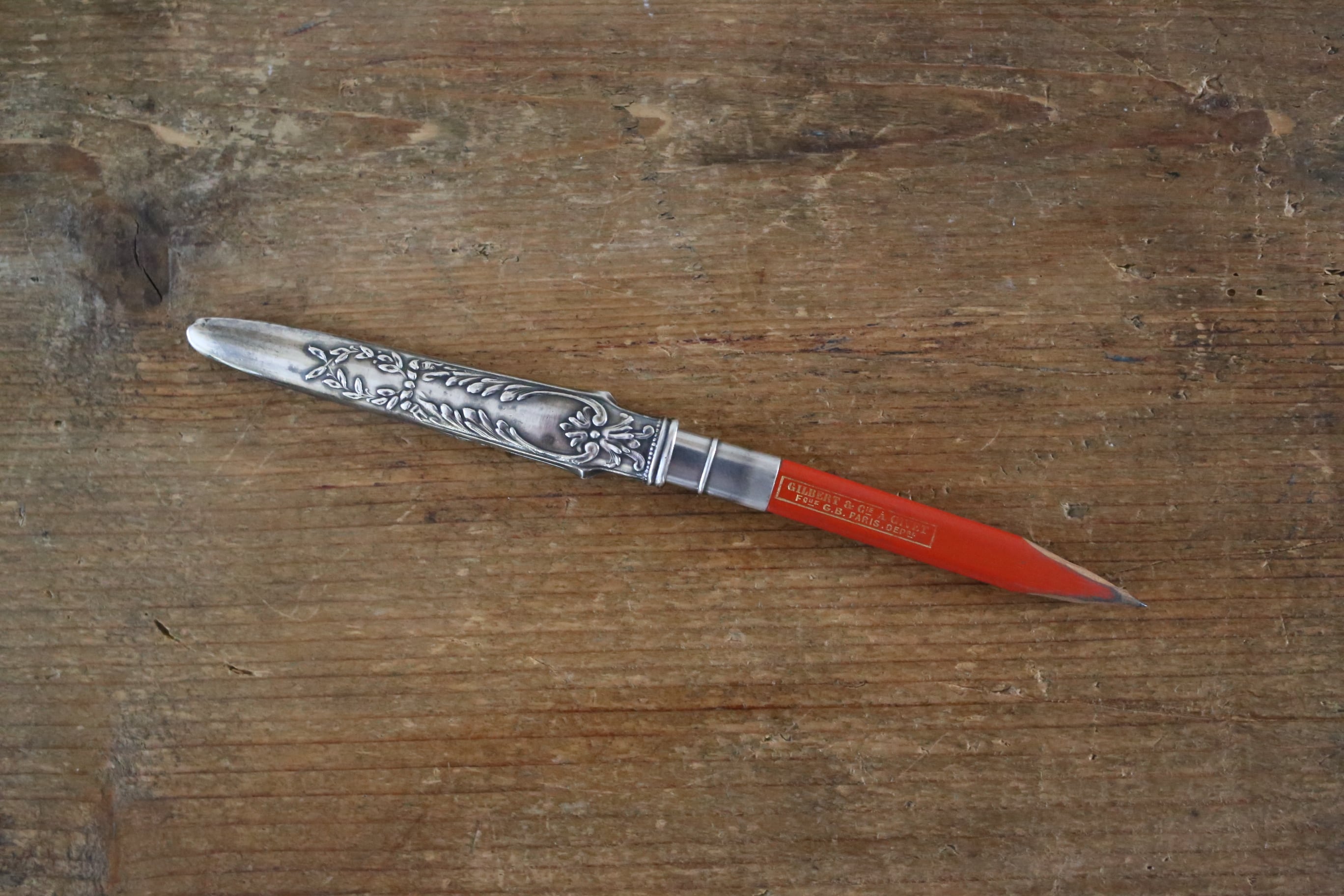 カーペンターペンシルと呼ばれる平たい鉛筆を入れて使用しますが、中に残った赤い鉛筆も素敵です。
