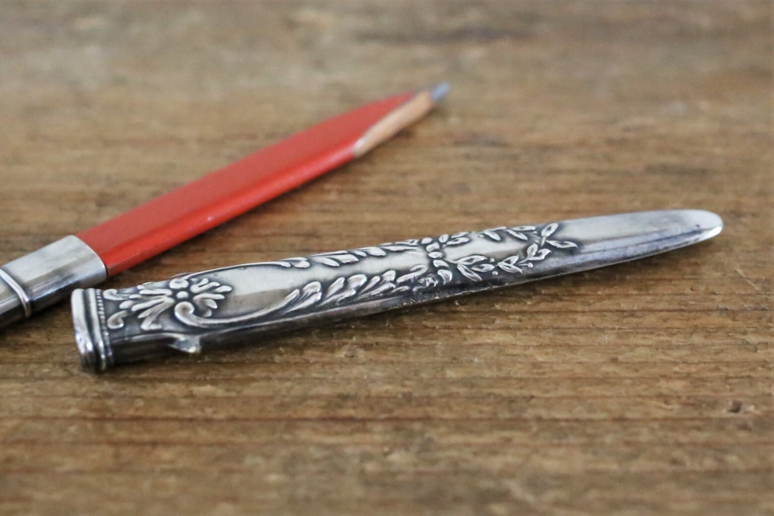 美しい装飾が施されたシルバープレートのペンシルケースです。