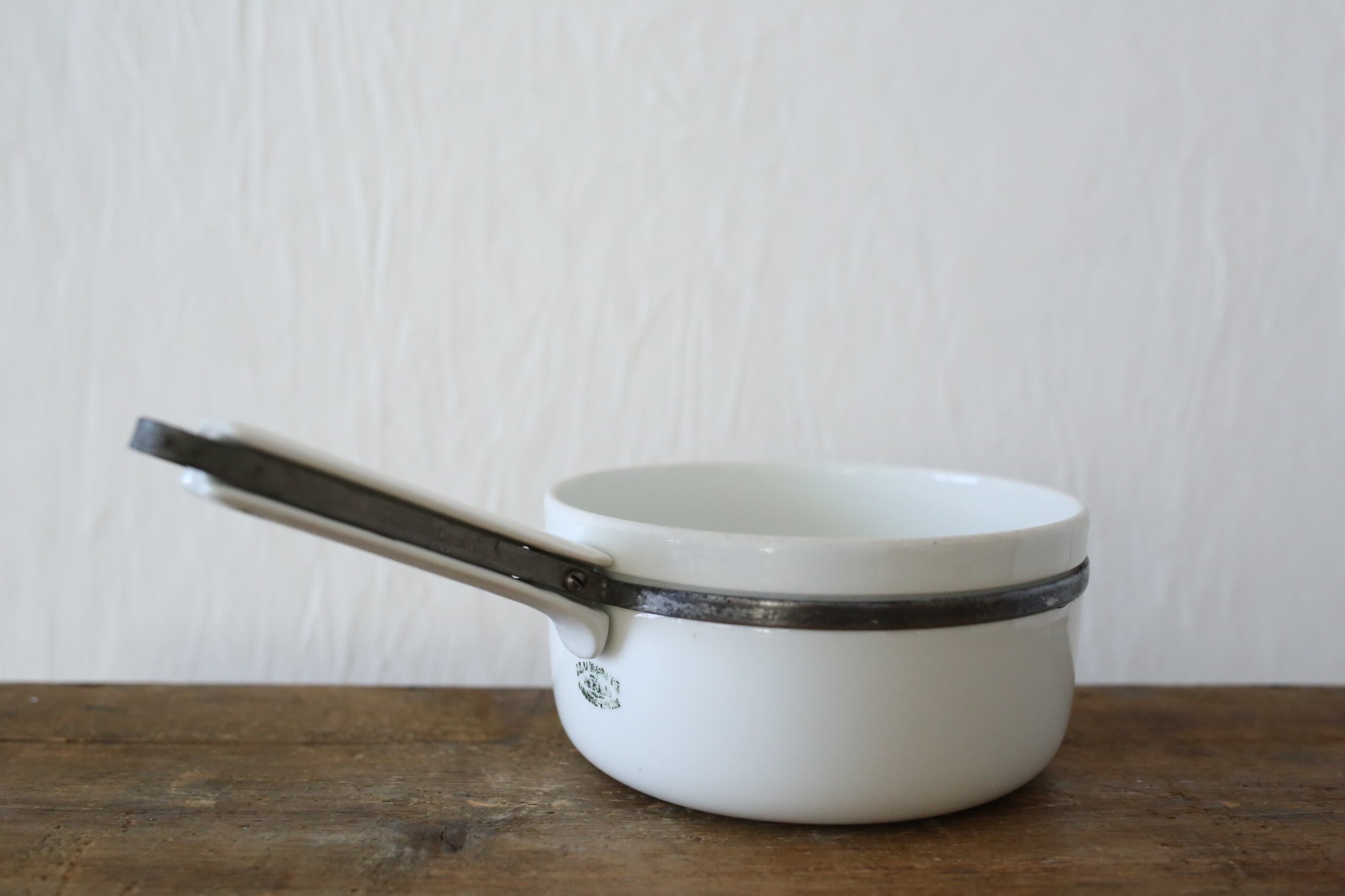 直火にかけられる磁器として1900年前半の開発されましたが、シンプルなデザインと白磁がとても美しい鍋です。
