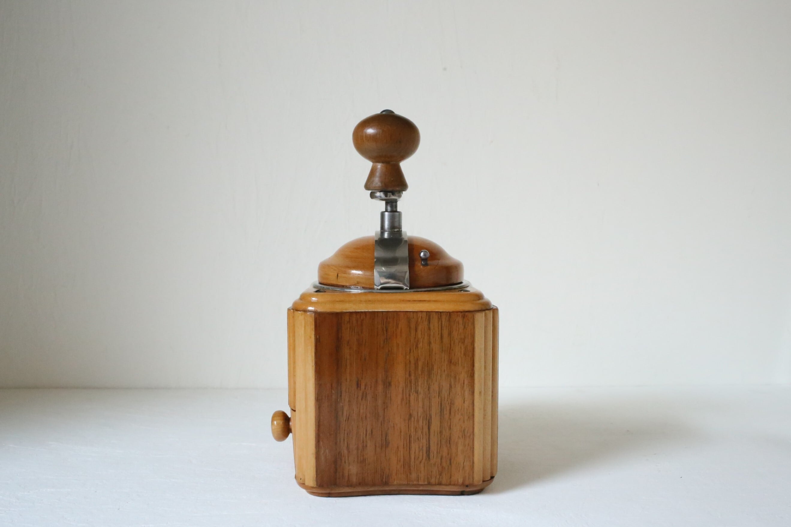ヴィンテージのコーヒーミルで有名なフランス プジョー社のものよりも数多くのパーツで構成されており、挽かれたコーヒーが落ちるカップ部分はベイクライト製になっています。