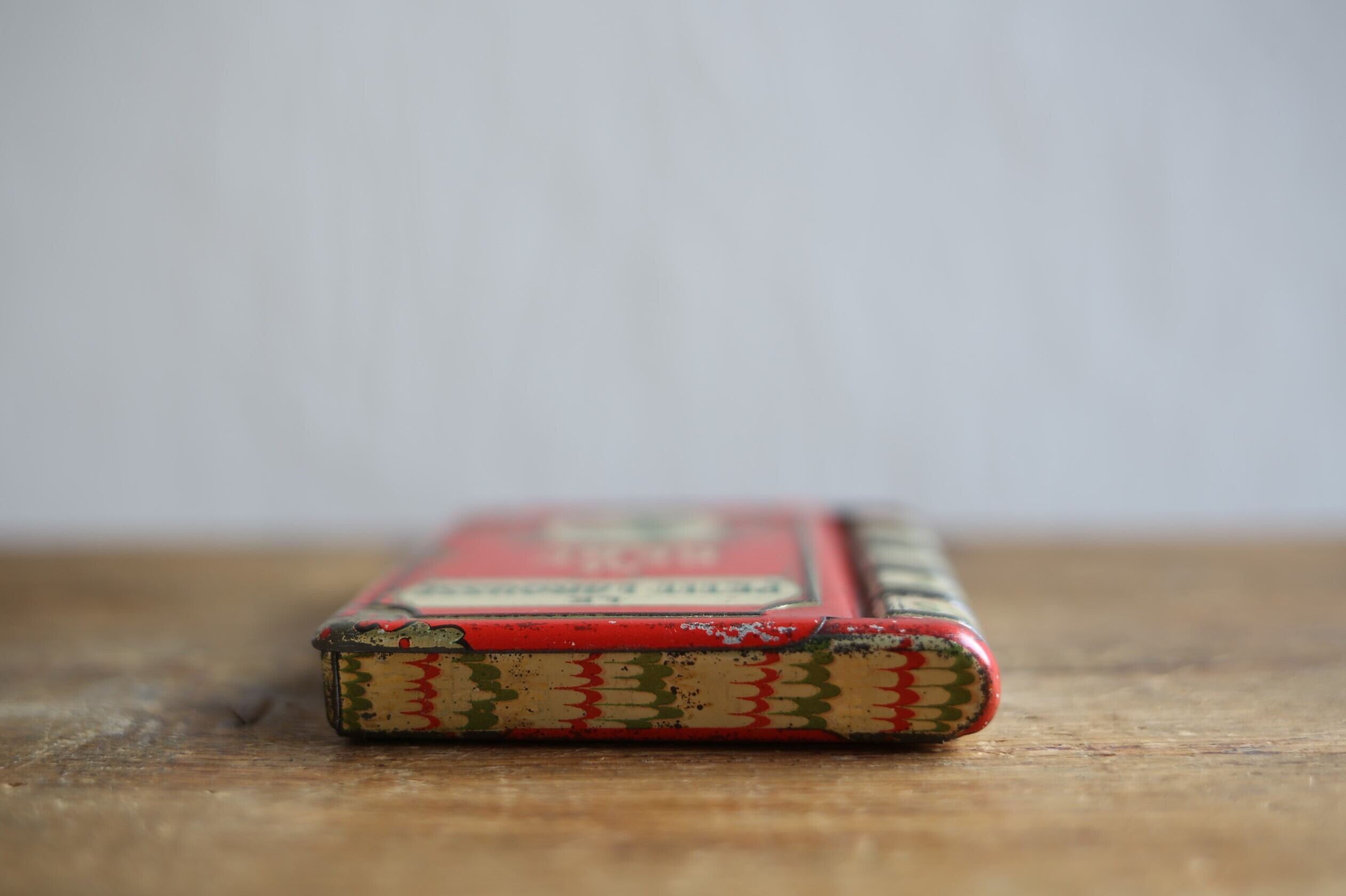 小さなペイントの剥離や微細なキズはありますが、蓋の開閉もスムーズで古いTIN缶としてはとても良い状態です。