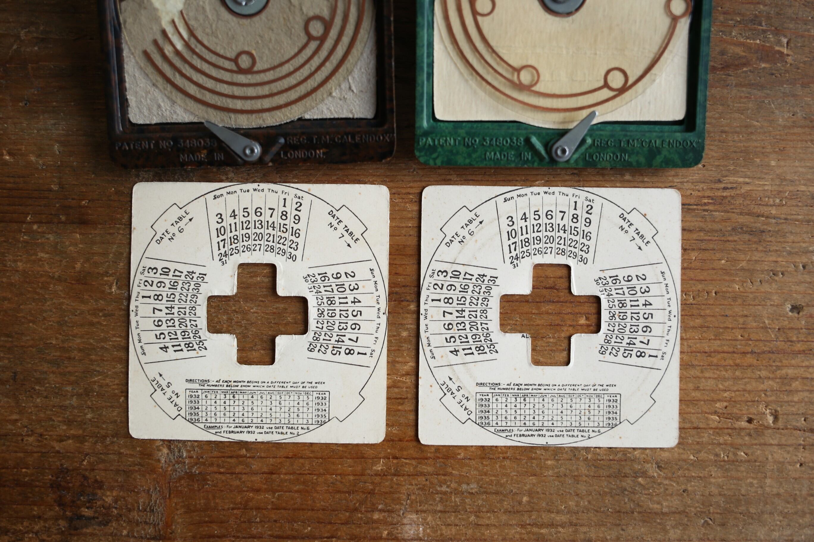 中のカレンダーが書かれた台紙には7つのカレンダーの合わせ方の説明箇所がありますが、そこに1932年から1936年の例が書かれていますので、おそらく1931年に製造されたものと推測できます。