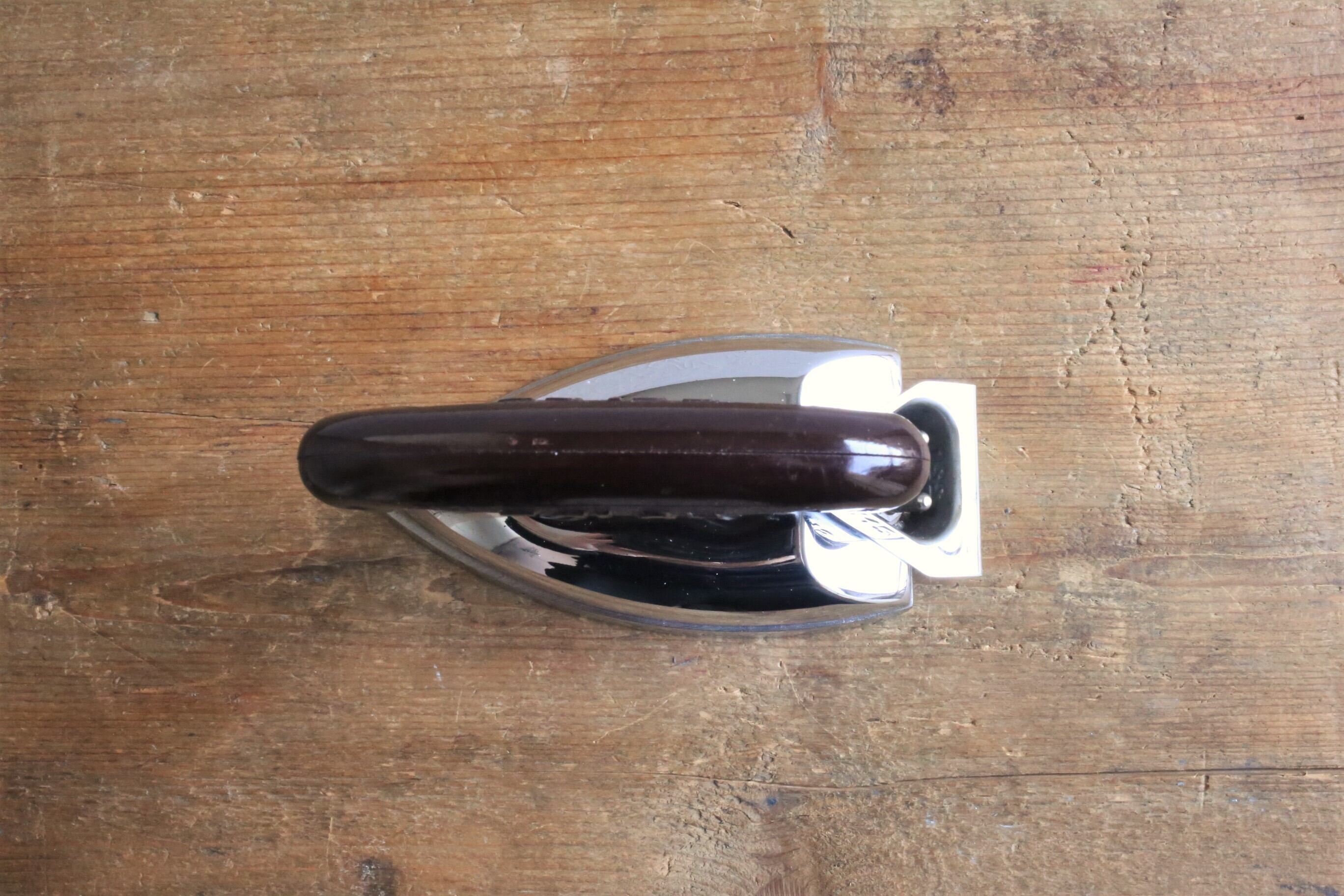 このアイロンの持ち手はブラウンとブラックの2色ありますが、こちらはブラウンのベークライトになります。