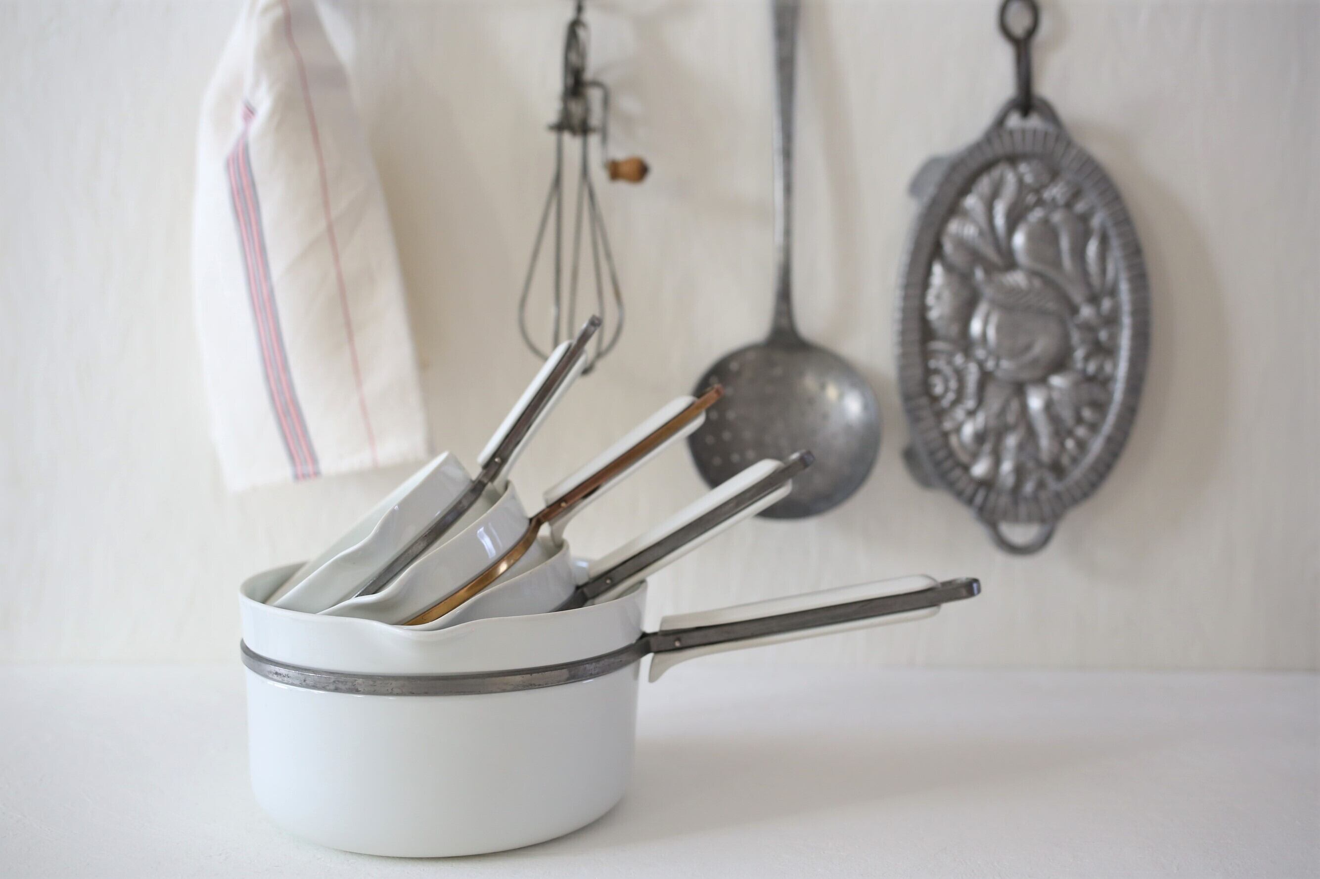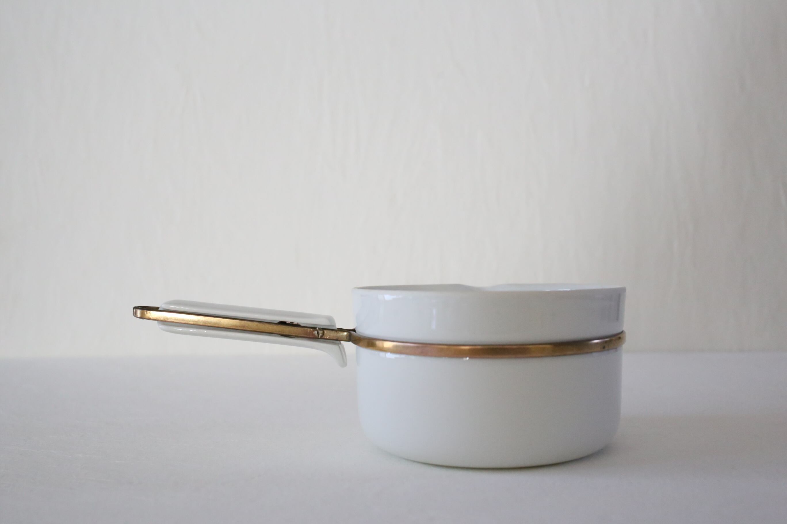 直火にかけられる磁器として1900年前半の開発されましたが、シンプルなデザインと白磁がとても美しい鍋です。