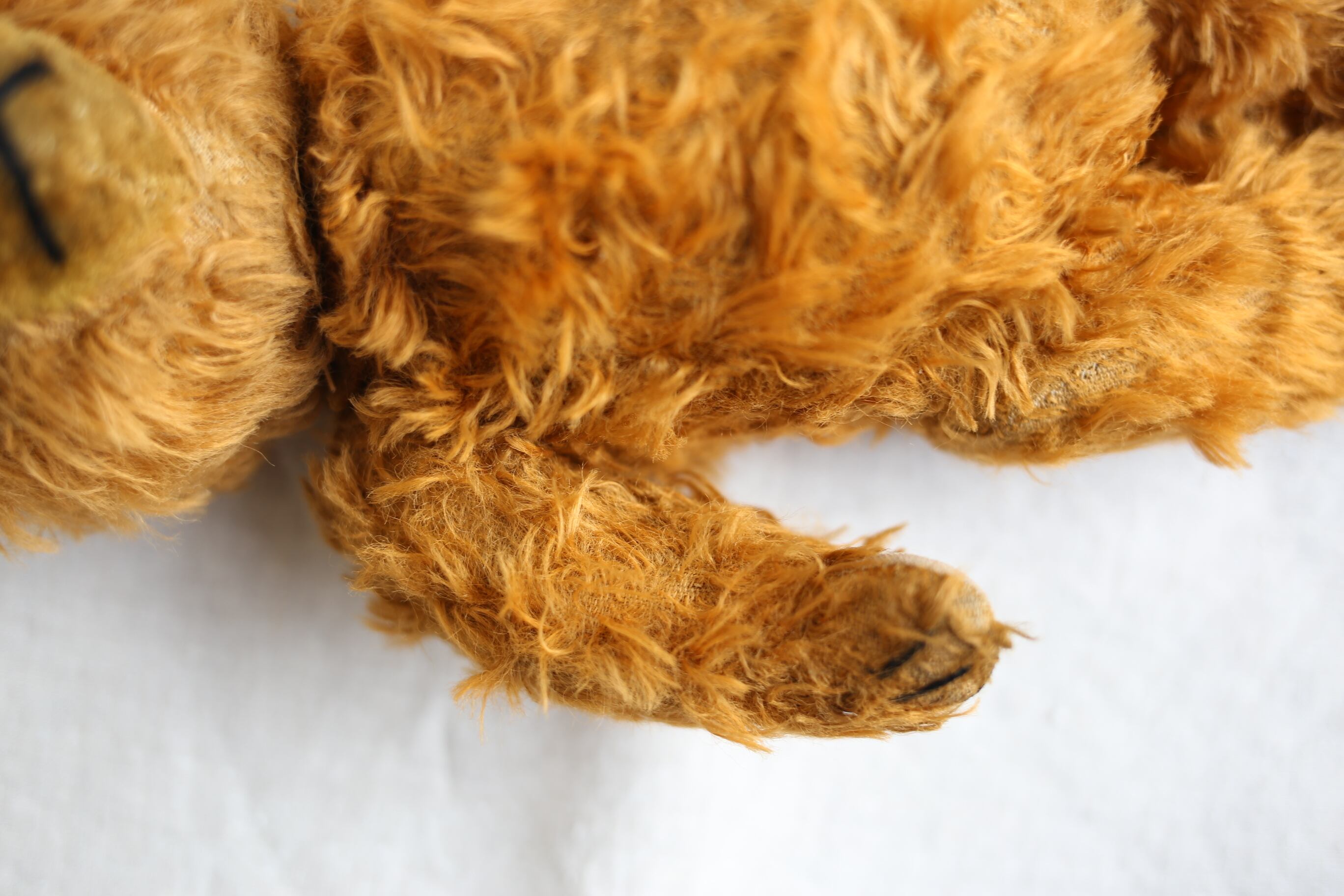 耳の付け根の補修跡や毛がなかったり薄い箇所、毛が寝てしまっている箇所などありますが、長年大切に可愛がられてきたことを想像させられる古いテディベアらしい素敵な佇まいです。