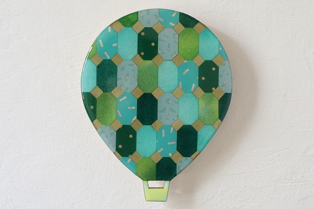 気球型に加工した木製板を土台にコラージュで制作しました。