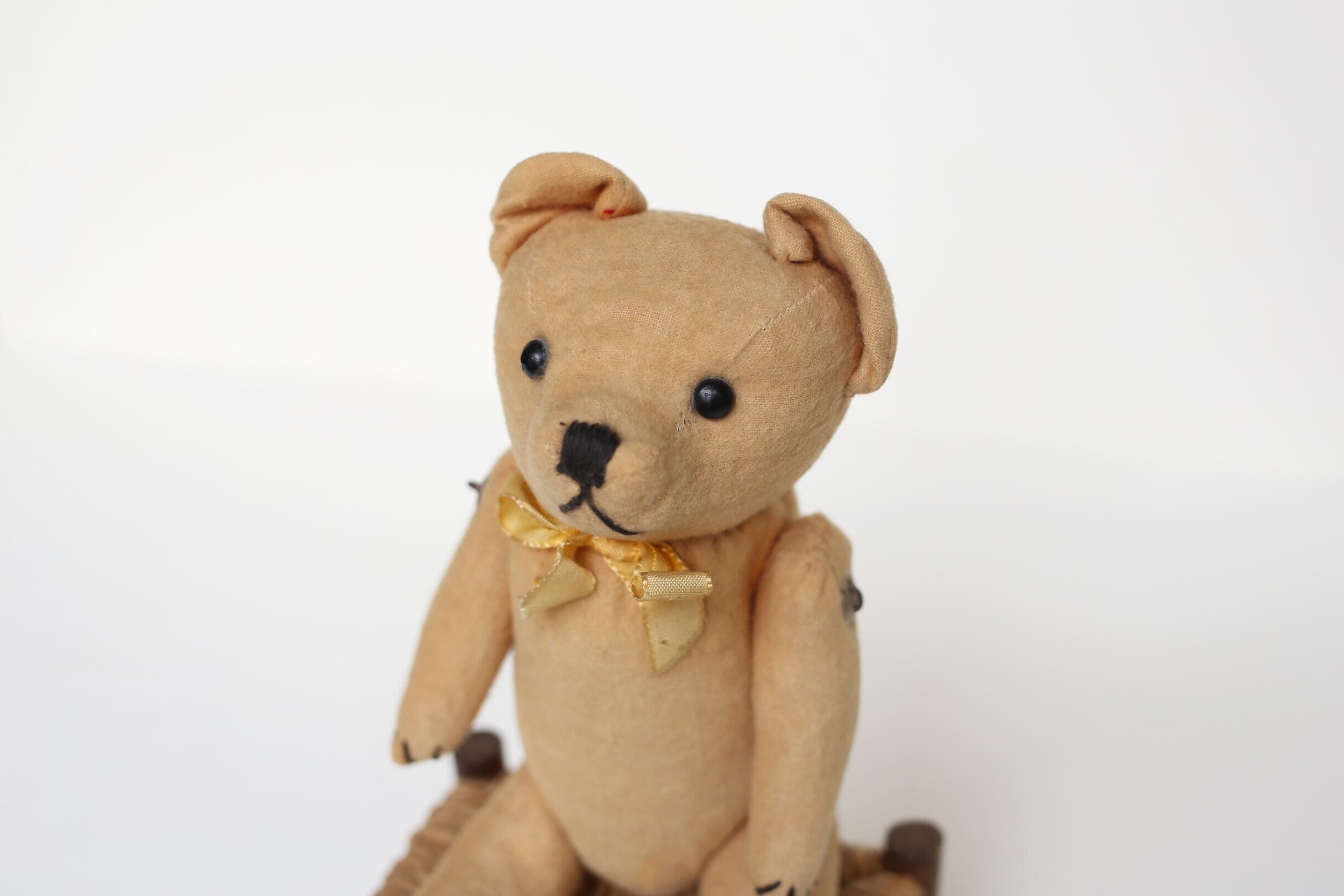 全体的に色焼けや生地自体が薄くなっている箇所があり、また所々に赤い糸で補修された跡が見られますが、全体的にはとても良い状態で長年大切に可愛がられてきた古いテディベアらしい素敵な佇まいです。