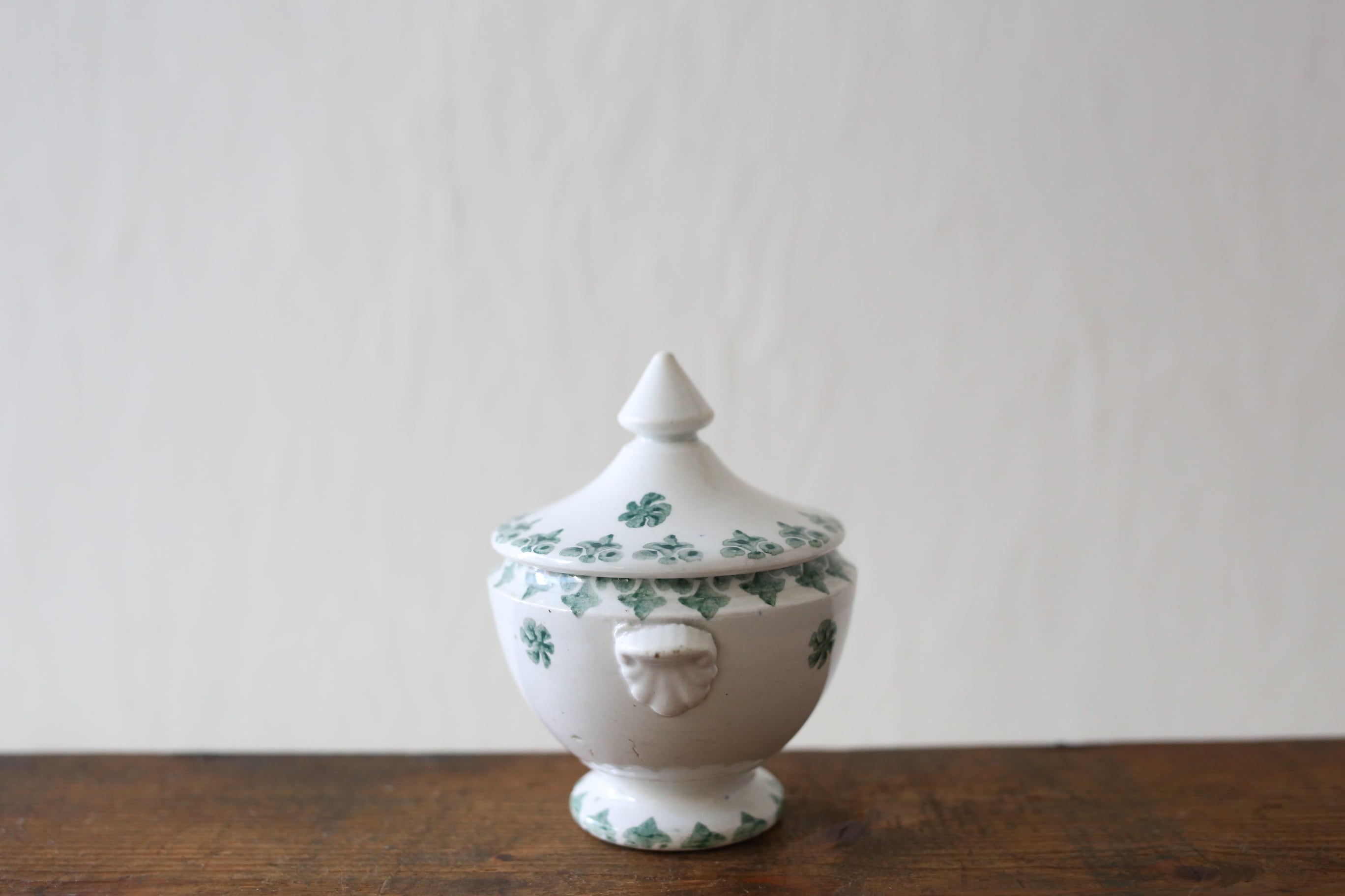 趣きのある陶器の質感に淡いグリーンの柄が優しく、そして何よりもフォルムが美しいです。