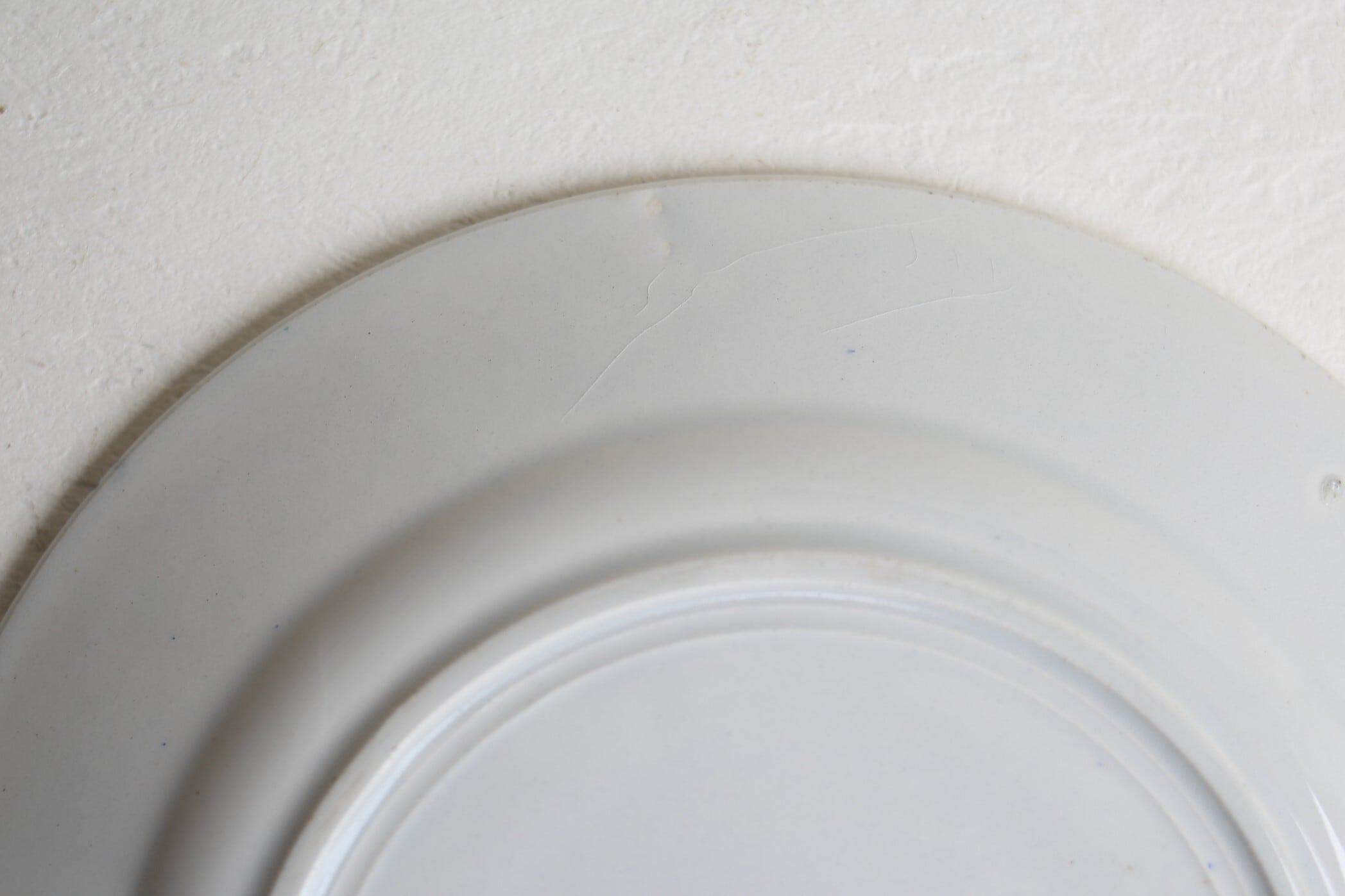 縁にスレてできたような薄い6mm程のカケが1点と、その他にカトラリー跡やスレや微細なキズはありますが目立つダメージもなく良い状態です。