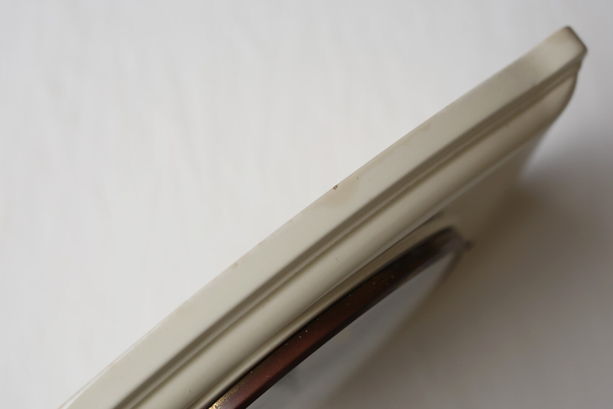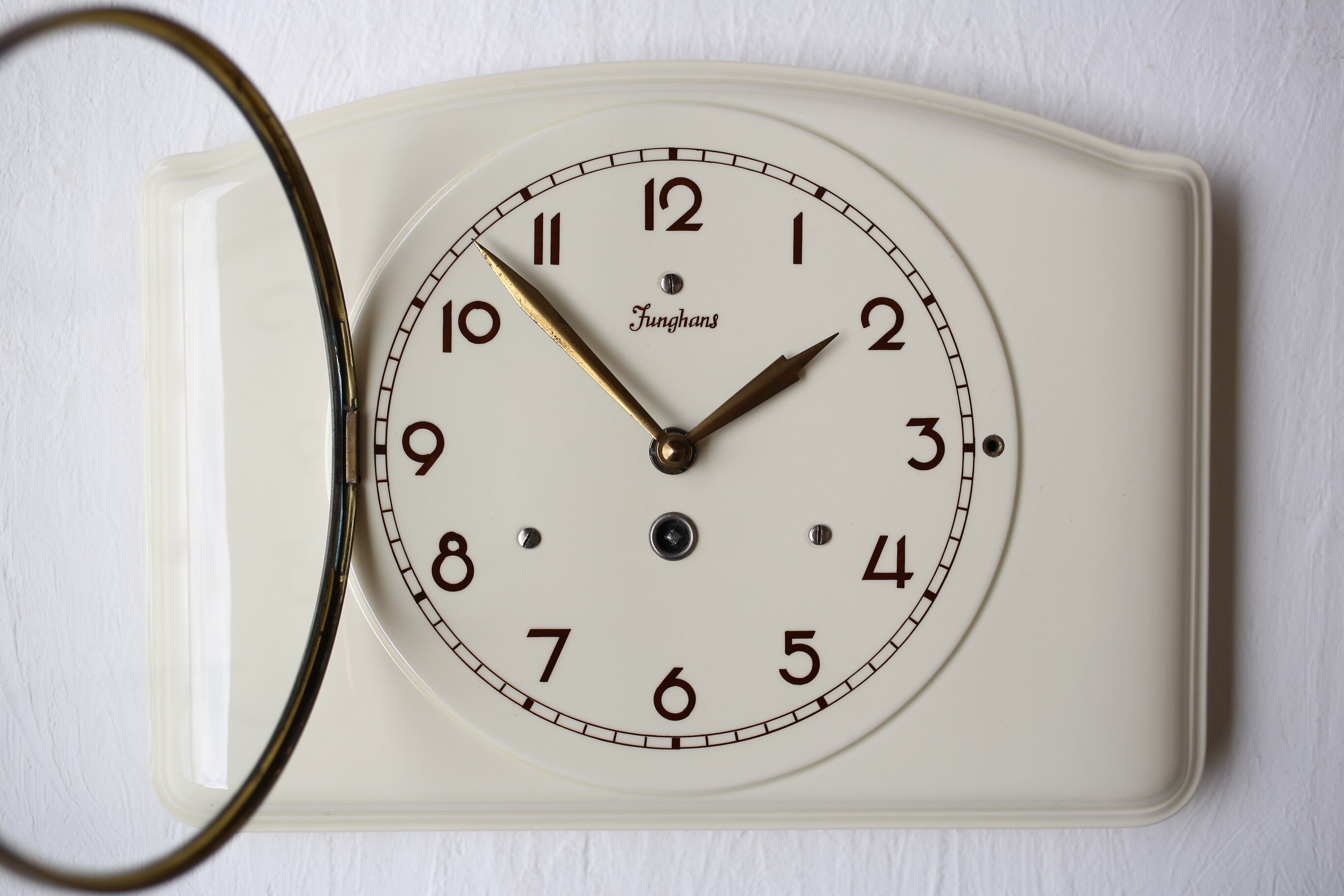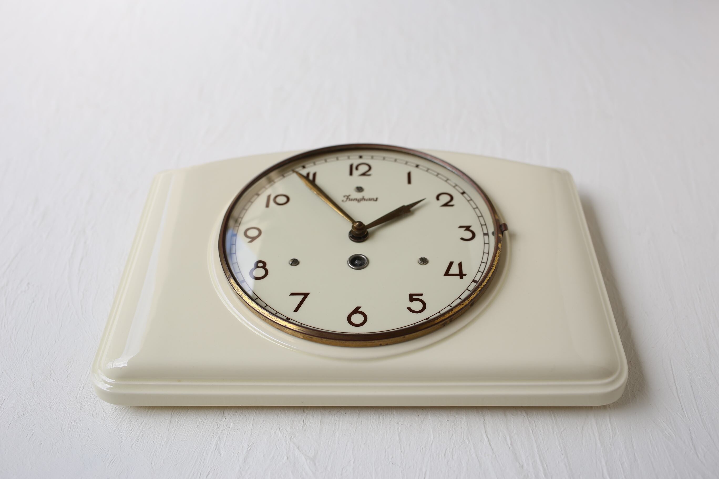 アールデコ調のフォルムのクリーム色の陶器にブラウンの文字や「JUNGHANS」のロゴ、くすんだゴールドの針やフレームの雰囲気が素敵な少し大きめの掛時計です。