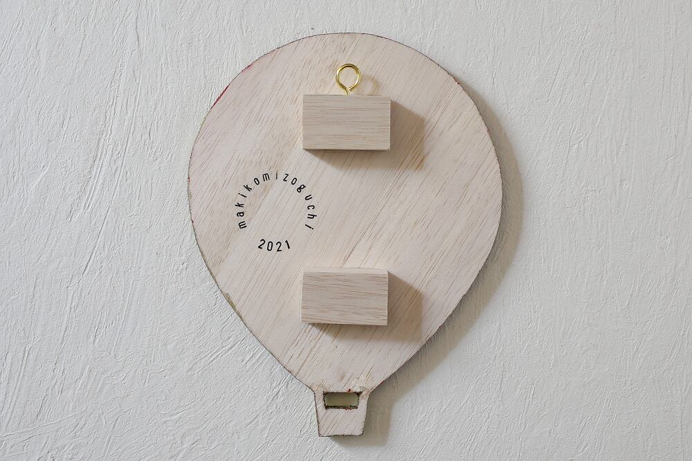 気球型に加工した木製板を土台にコラージュで制作しました。