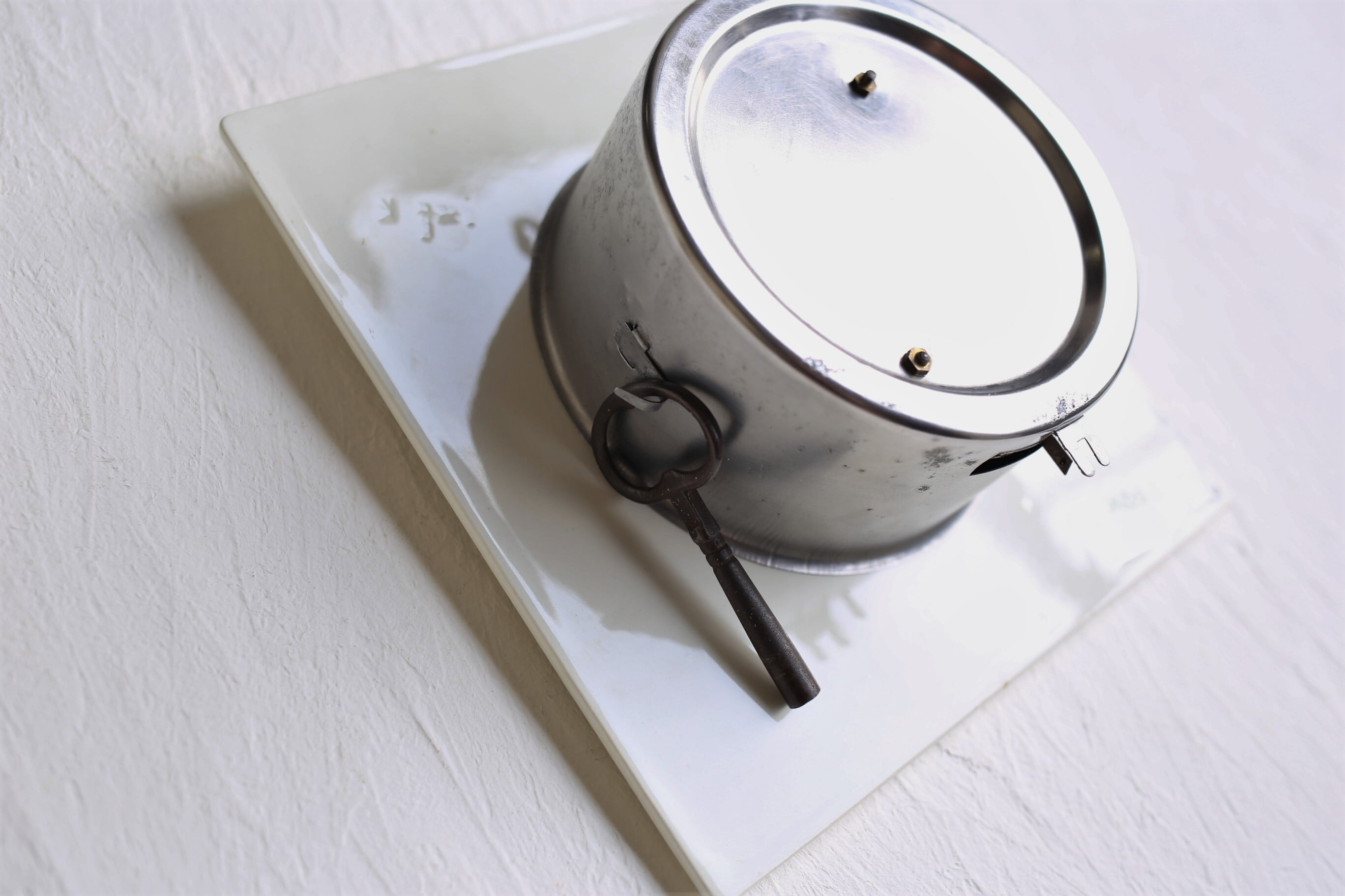 ゼンマイを巻くカギは側面のフックに掛けられるようになっています。