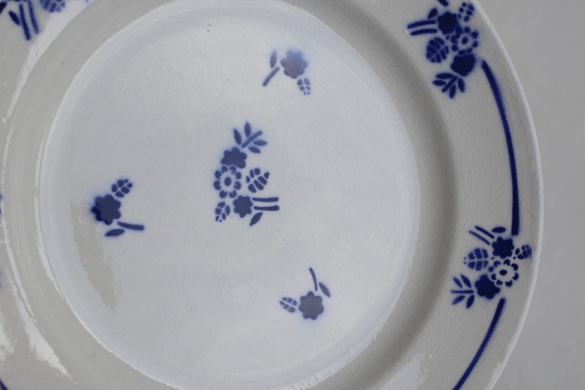 縁に3mm弱の小さなカケがあり、表面にわずかにカトラリー跡、底に貫入染みはありますが、その他製造時の色移りやムラ程度で使用感の少ない良い状態です。