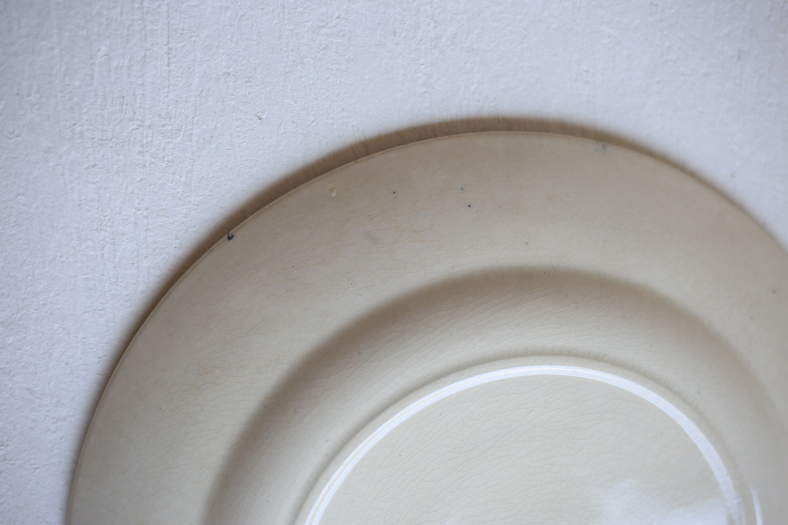 表面にカトラリー跡や釉薬が薄くなった箇所があり薄っすらと色付きもありますが、その他は製造時の色移りやムラ程度で目立つダメージもなく、全体的にはアンティークプレートならではの風合いの良い状態です。
