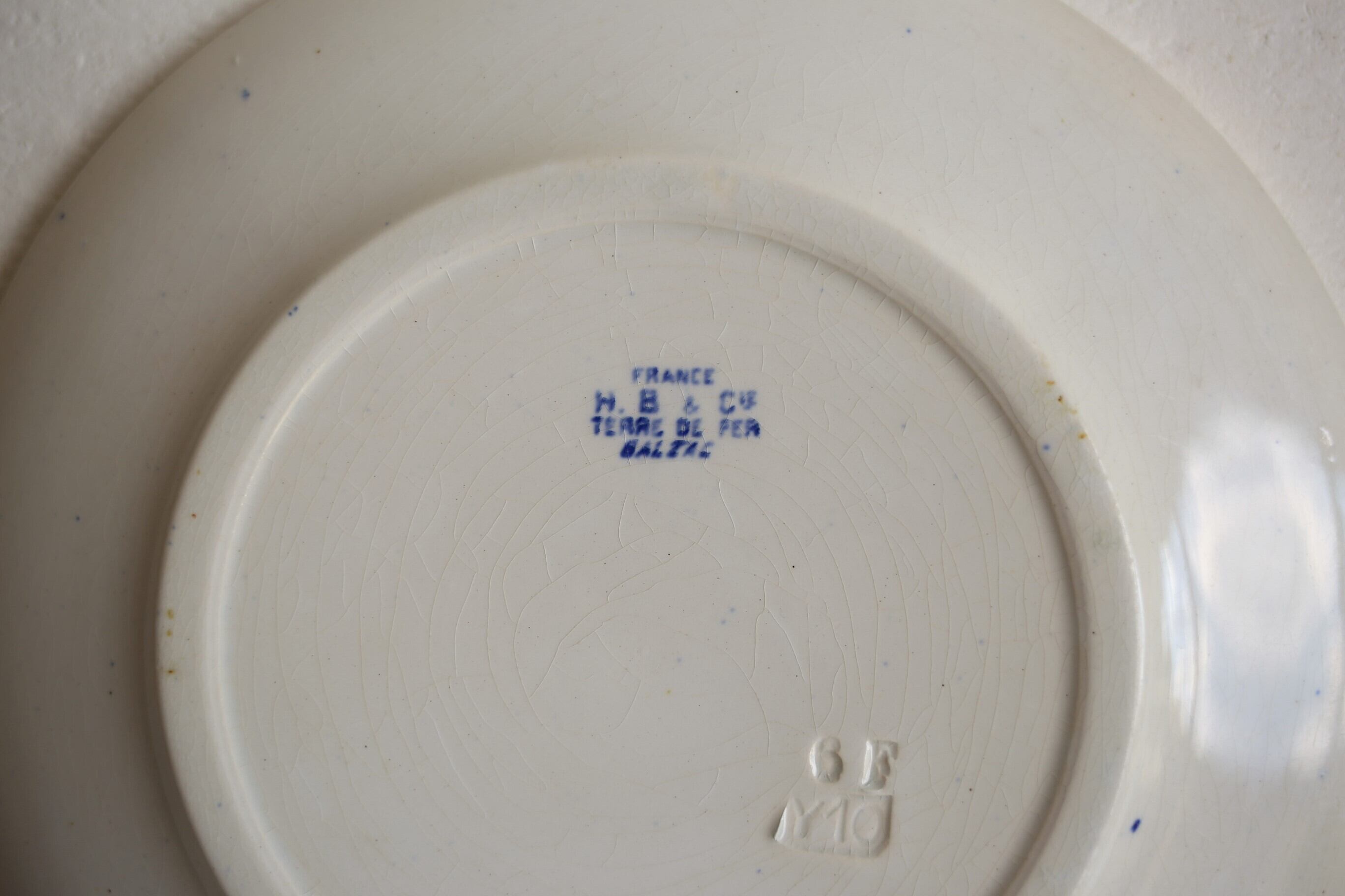 表面にカトラリー跡やスレ、製造時の色移りや転写ズレ、ムラなどありますが、全体的には貫入や釉薬の風合いも良く、アンティークプレートとしては良い状態です。