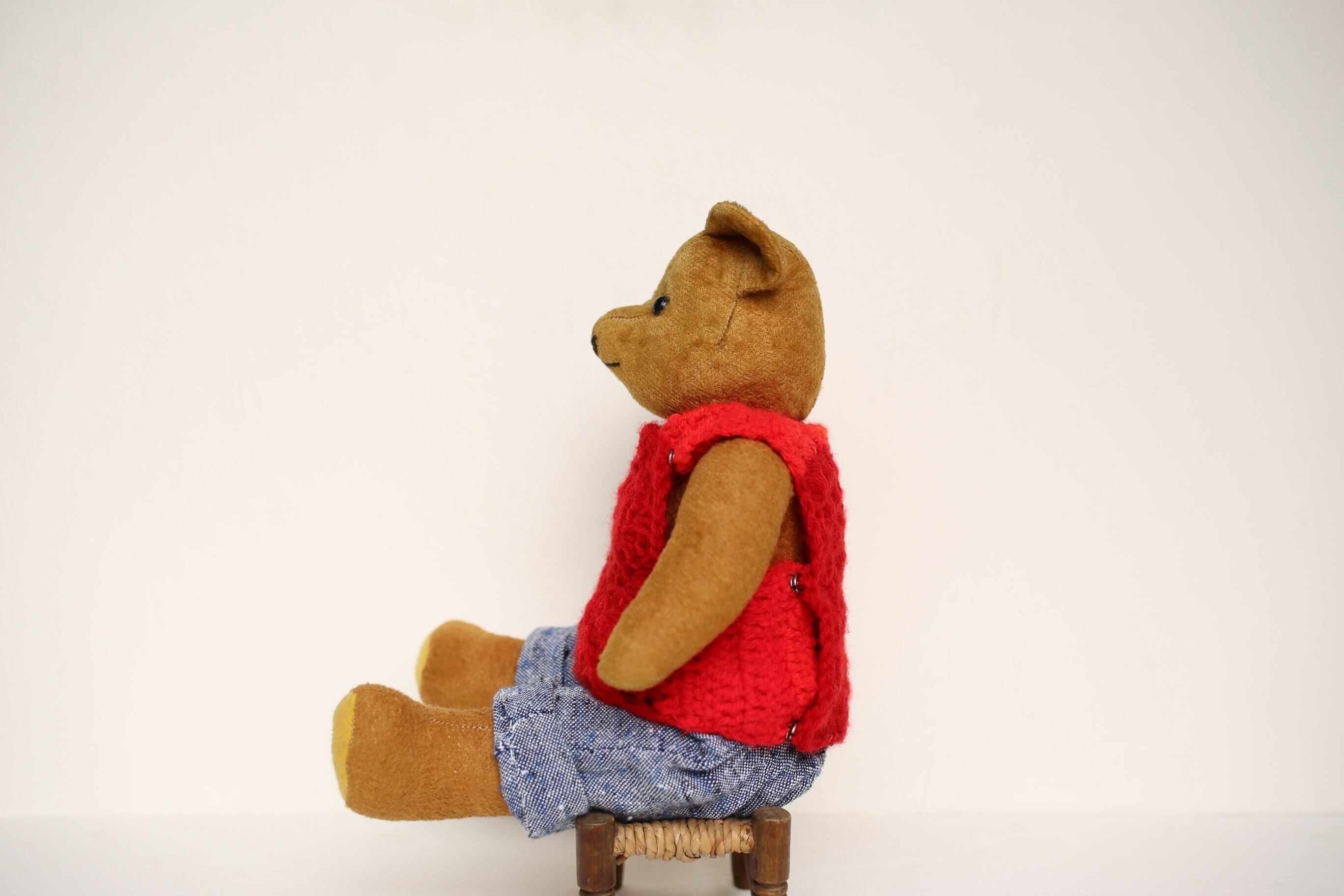 フランス アンティーク ヴィンテージ 赤いニットベストを着たテディベア 37cm N-03337