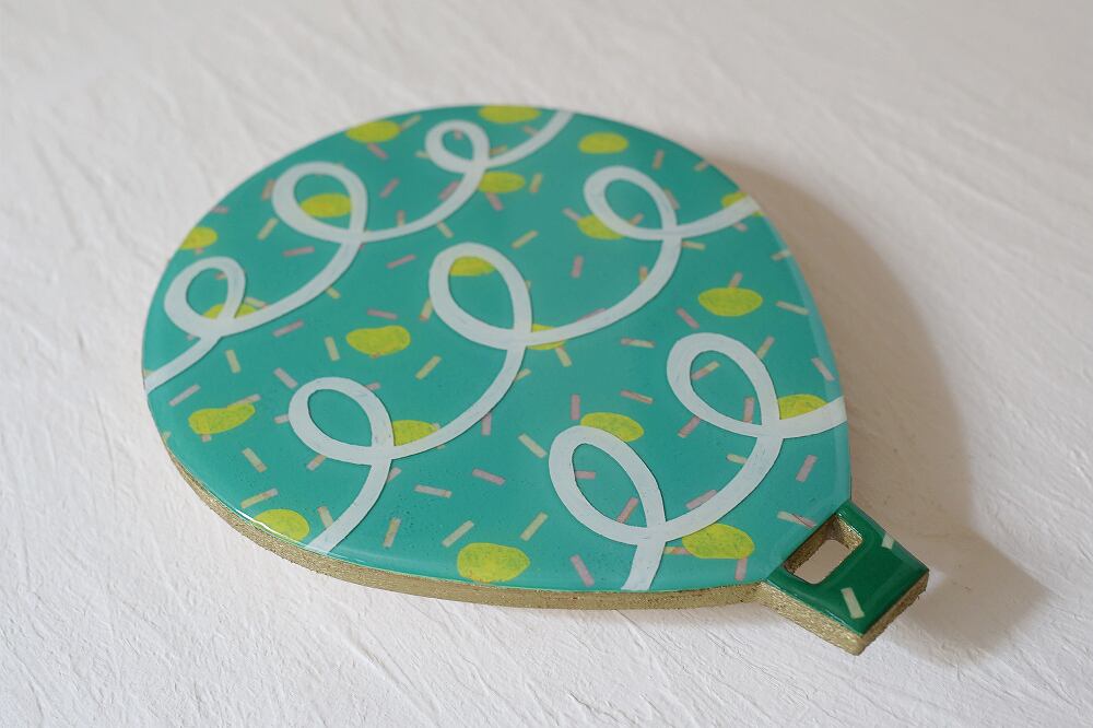 気球型に加工した木製板を土台にコラージュで制作しました。