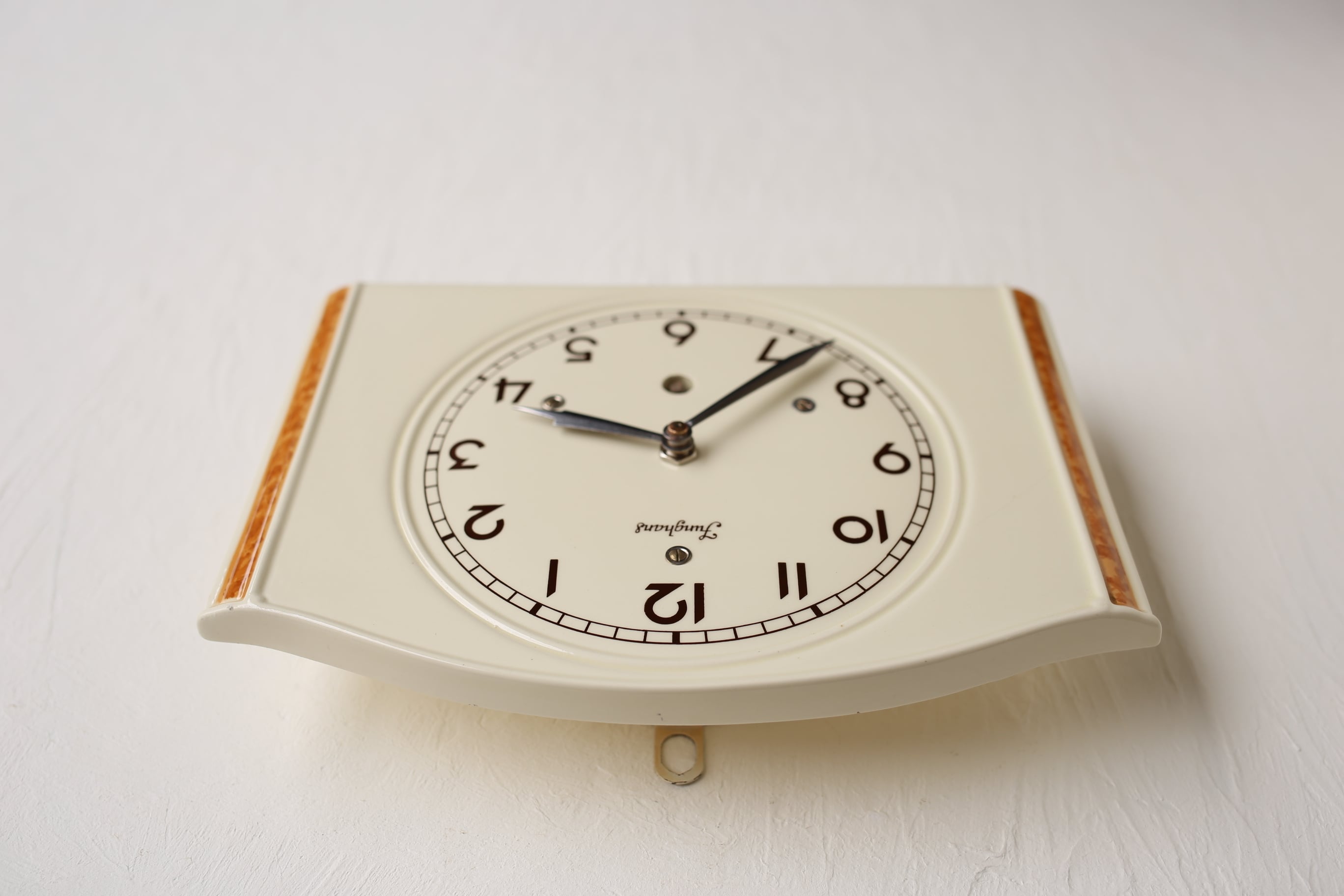 アールデコ調のデザインとクリーム色の陶器にブラウンの縁取りや「JUNGHANS」のロゴが素敵な時計です。