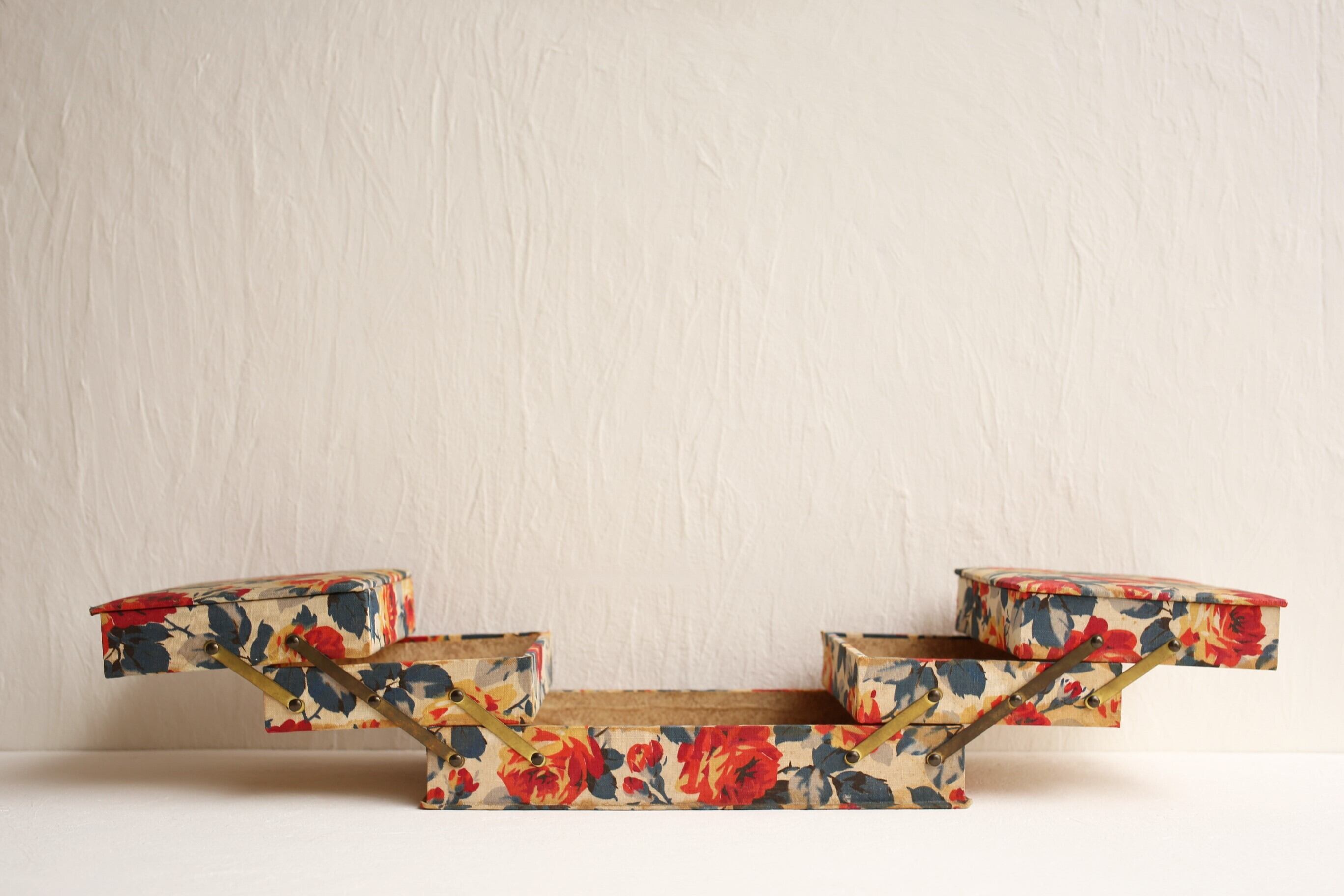 フランスから届いたカルトナージュの3段のソーイングボックスです。