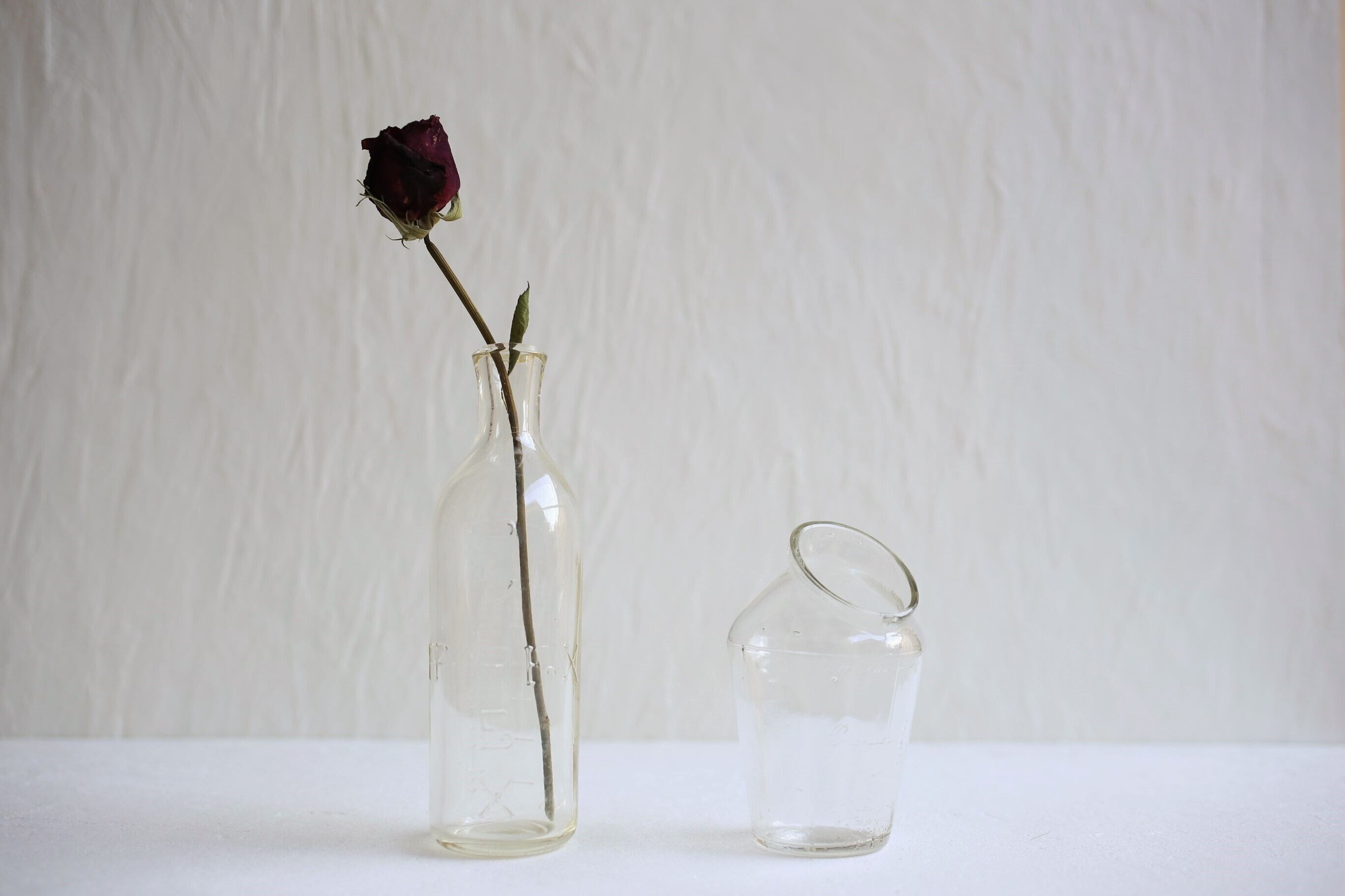 ガラス瓶はそのまま並べて飾るだけでも素敵ですが、一輪挿しにもちょうどよいサイズです。