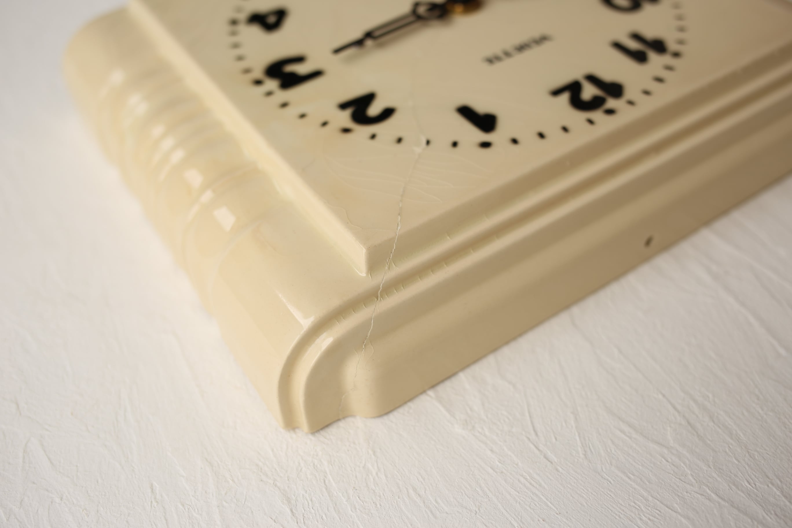 落ち着いた濃いめのアイボリーの陶器に特徴的な数字やロゴ、針が映えるアールデコ調の素敵な時計です。