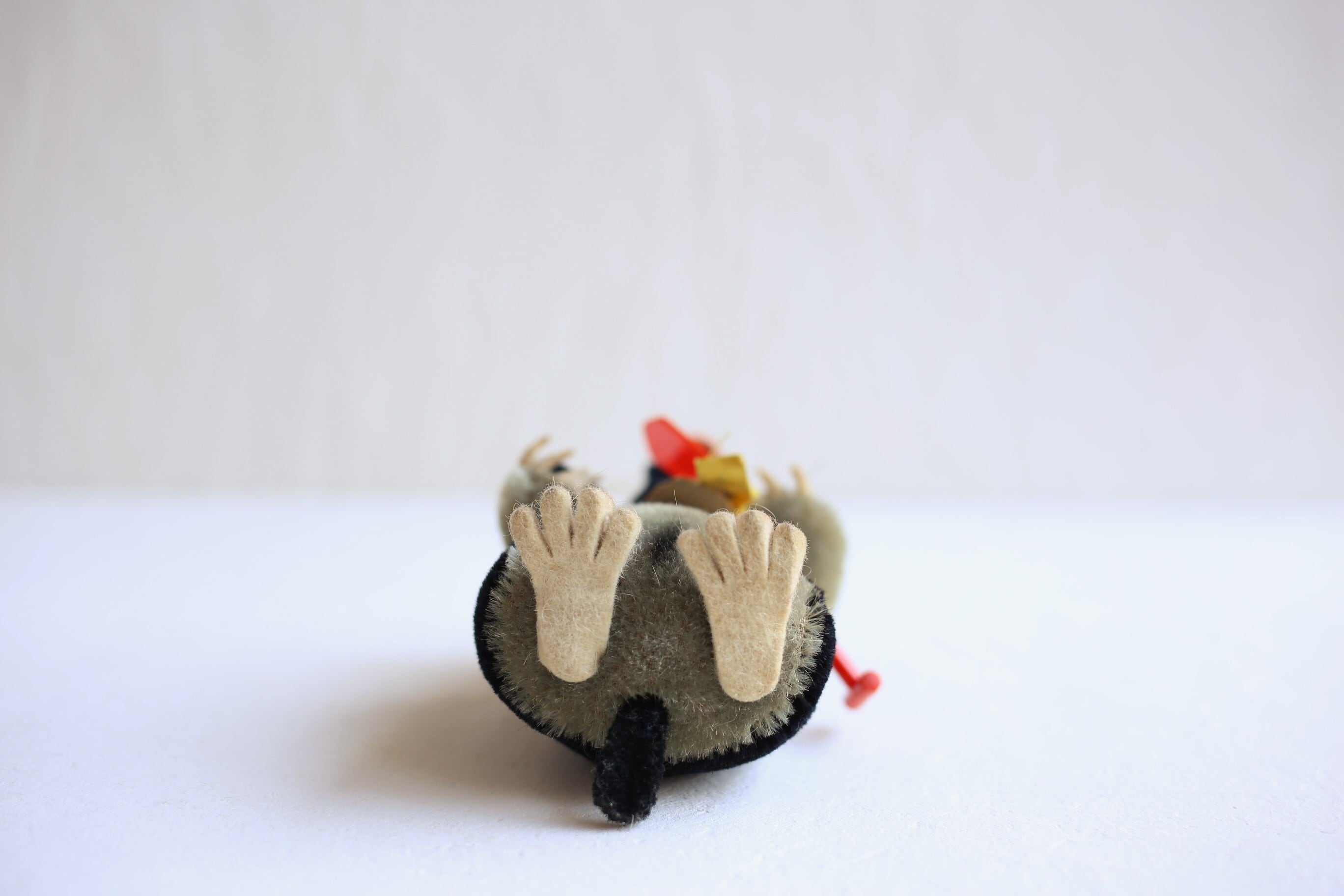 つぶらな黒い瞳に長いヒゲとオレンジ色のフェルトの大きな鼻、手足の指やちょこんと付いた短い尻尾など細部までしっかりと作られていてとても可愛らしい佇まいです。